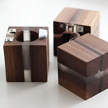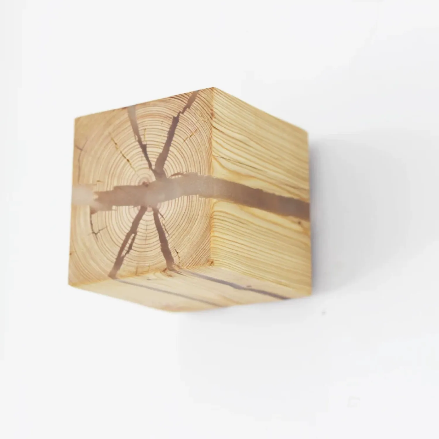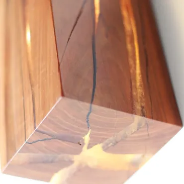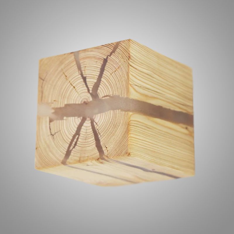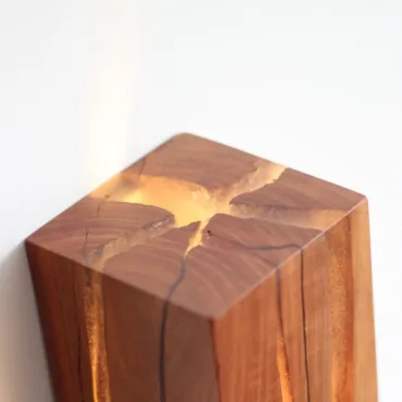 Настенный светильник в виде куба выполнен из натурального дерева с выразительной текстурой. Особенность модели — светящиеся «трещины», создающие оригинальный световой узор. Компактный и стильный, он станет акцентным элементом интерьера спальни, прихожей или гостиной. Сочетает экологичность материала и современный дизайн.