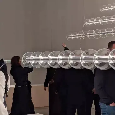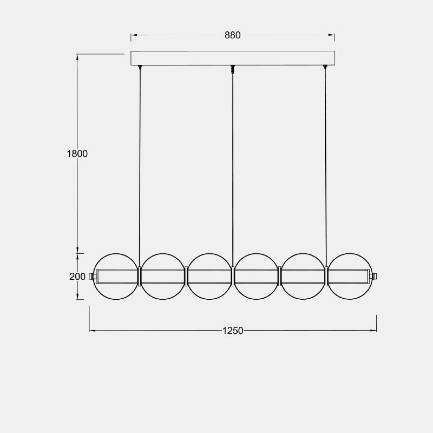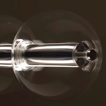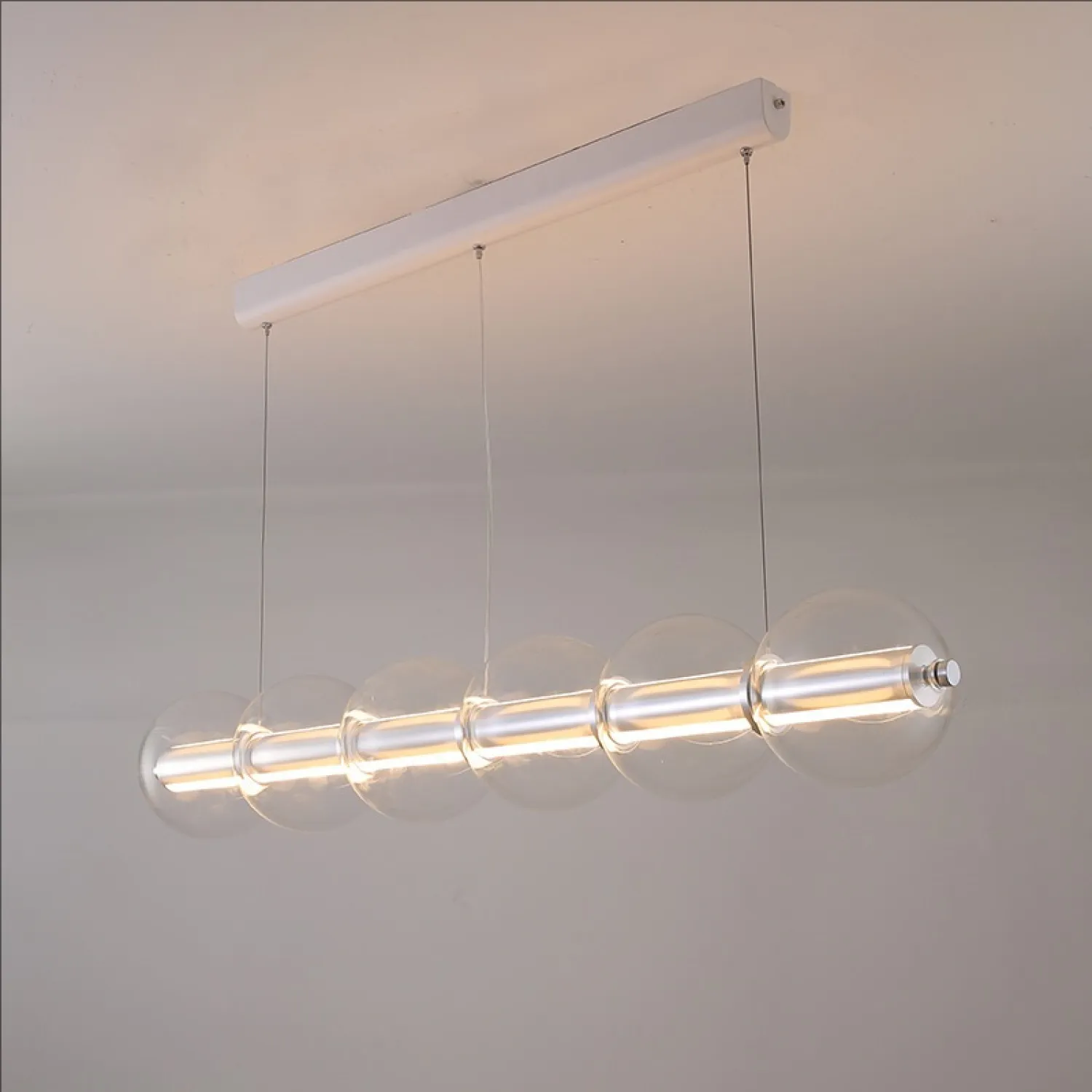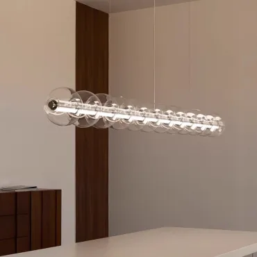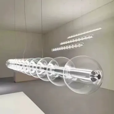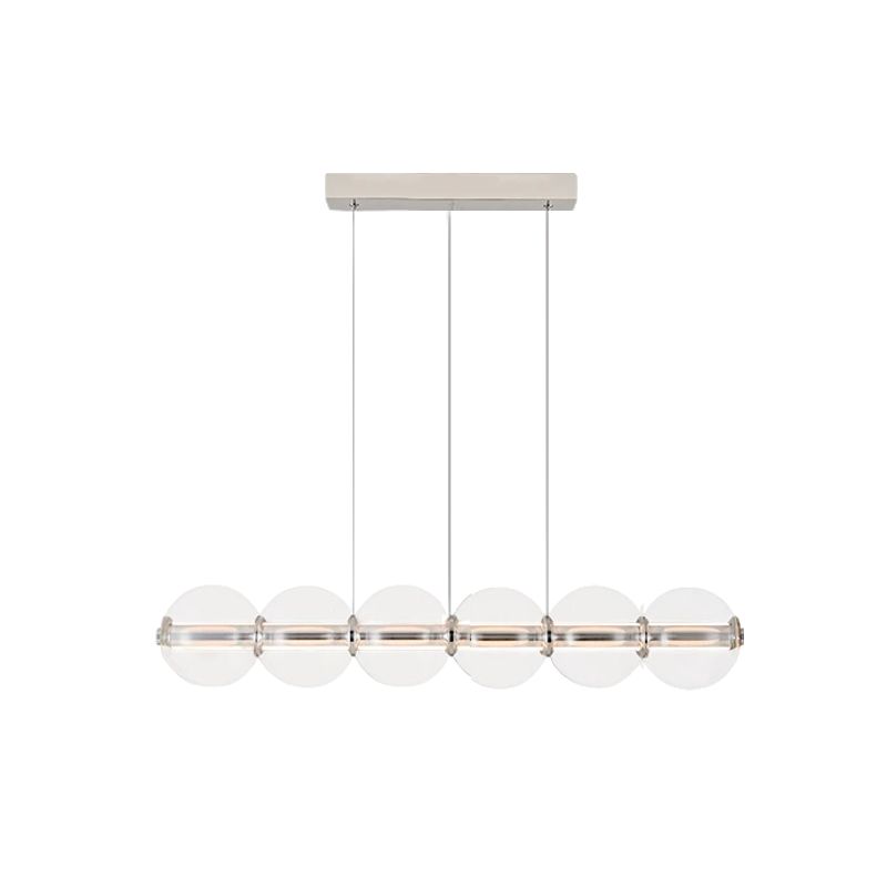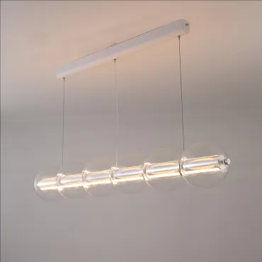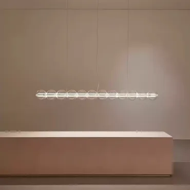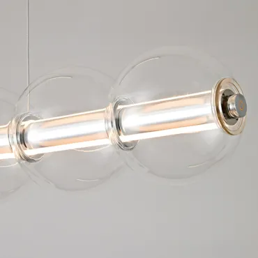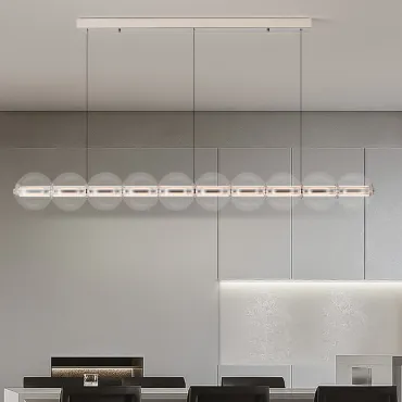 Современный подвесной светильник с лаконичным дизайном станет изюминкой интерьера. Конструкция состоит из горизонтальной металлической основы и ряда прозрачных стеклянных шаров, равномерно распределённых по длине. Мягкое рассеянное освещение создаёт уютную атмосферу, подчёркивая стиль кухни или столовой зоны. Элегантная модель гармонично сочетается с минималистичным декором и добавляет пространству нотку утончённости. Боковой выключатель позволит регулировать освещение и выбирать цвет свечения.