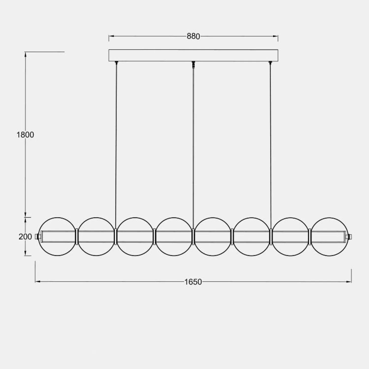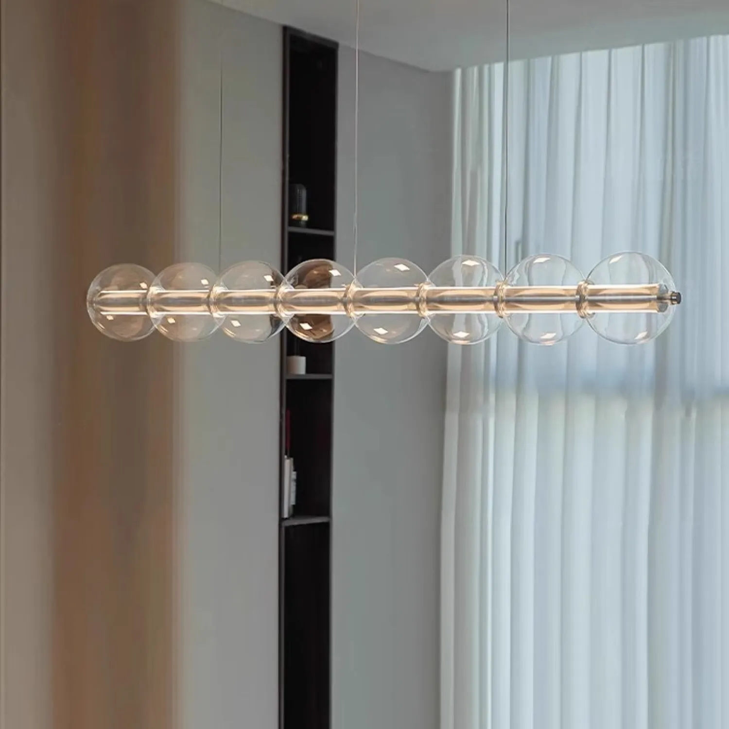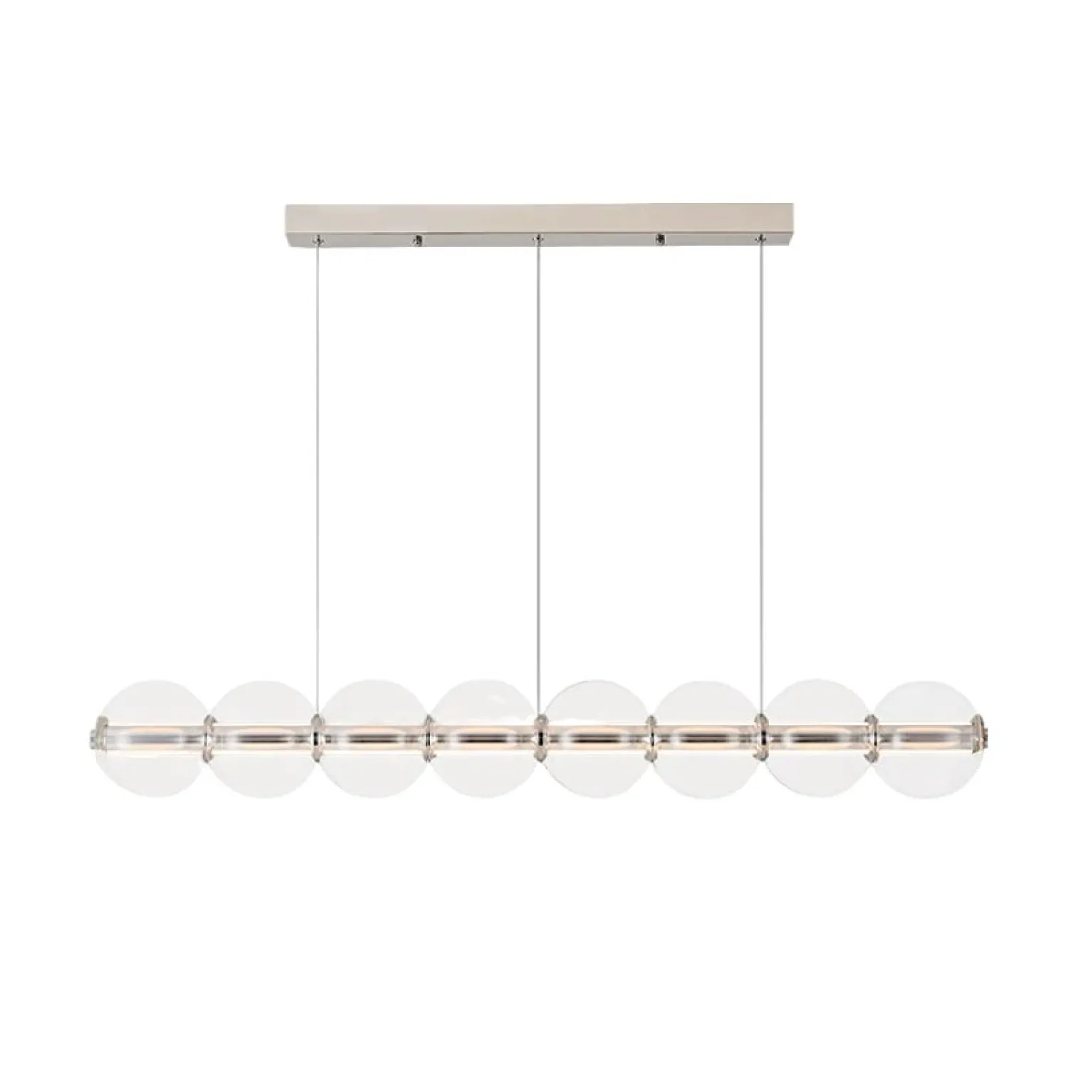 Современный подвесной светильник с лаконичным дизайном станет изюминкой интерьера. Конструкция состоит из горизонтальной металлической основы и ряда прозрачных стеклянных шаров, равномерно распределённых по длине. Мягкое рассеянное освещение создаёт уютную атмосферу, подчёркивая стиль кухни или столовой зоны. Элегантная модель гармонично сочетается с минималистичным декором и добавляет пространству нотку утончённости. Боковой выключатель позволит регулировать освещение и выбирать цвет свечения.