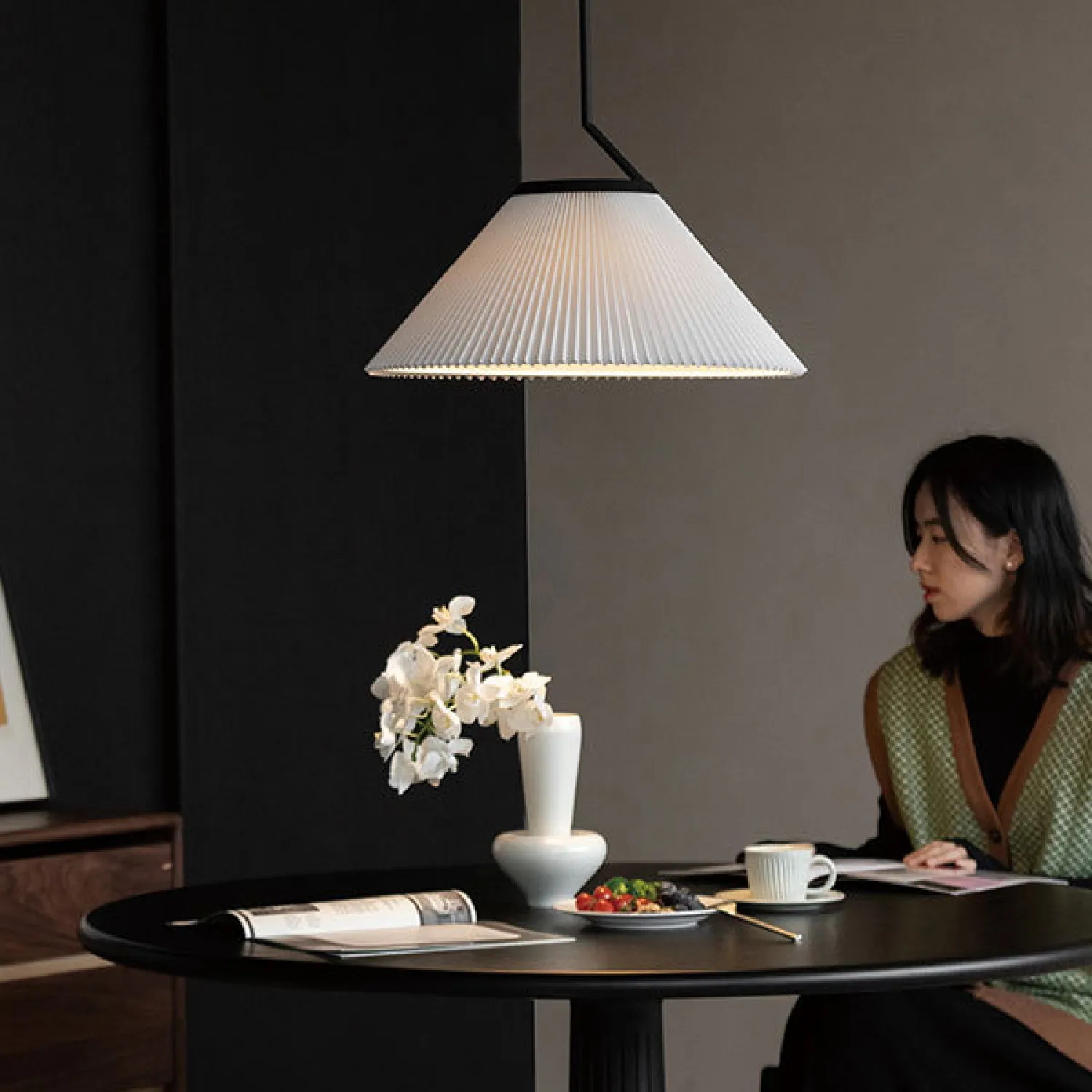 Подвесная люстра с плиссированным абажуром создаёт мягкий, уютный свет, подчёркивая стиль интерьера. Текстильный абажур с изящными складками придаёт светильнику элегантность и воздушность, а лаконичная чёрная подвеска добавляет современный акцент. Идеальный выбор для спальни или гостиной, где ценится сочетание комфорта и дизайна.