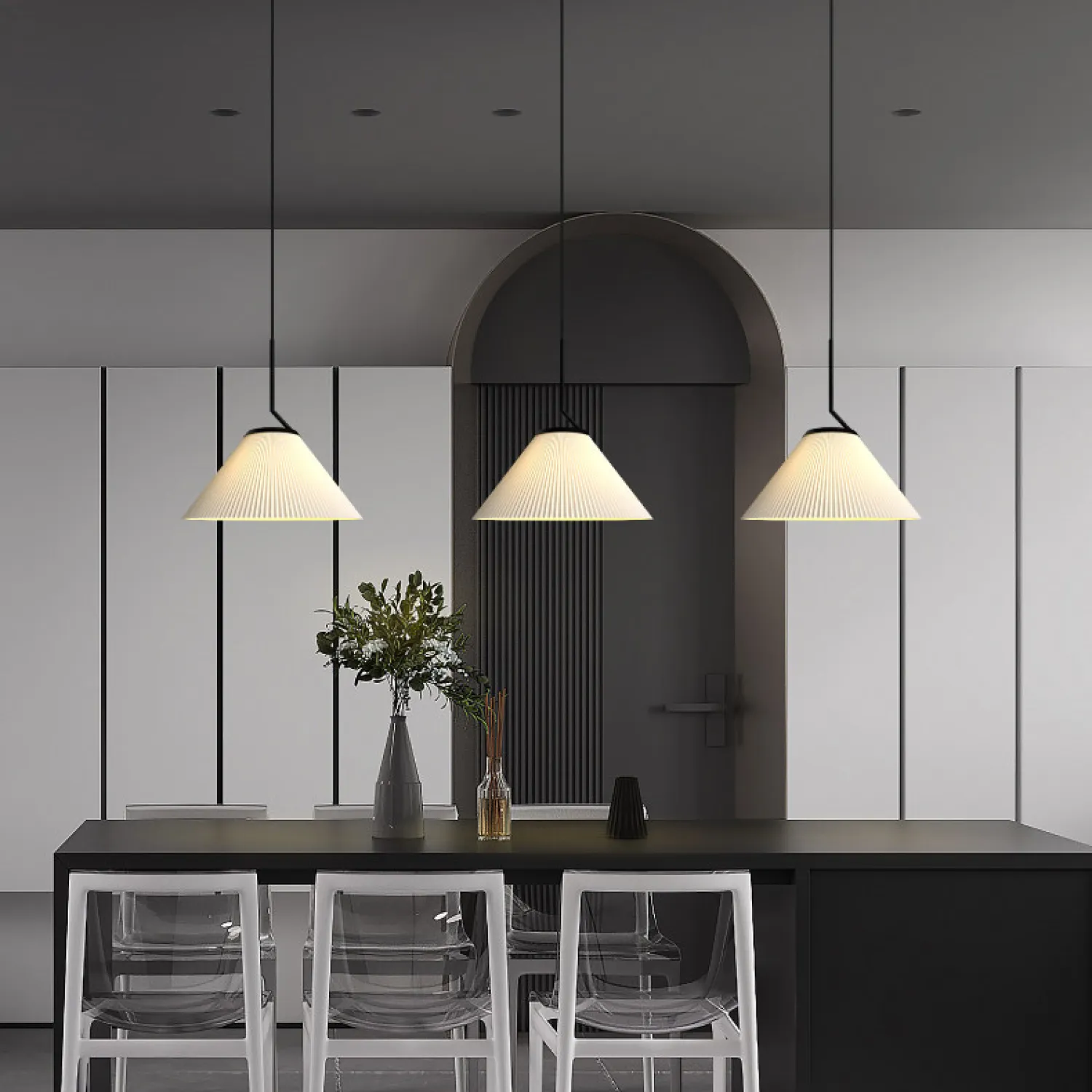 Подвесная люстра с плиссированным абажуром создаёт мягкий, уютный свет, подчёркивая стиль интерьера. Текстильный абажур с изящными складками придаёт светильнику элегантность и воздушность, а лаконичная чёрная подвеска добавляет современный акцент. Идеальный выбор для спальни или гостиной, где ценится сочетание комфорта и дизайна.
