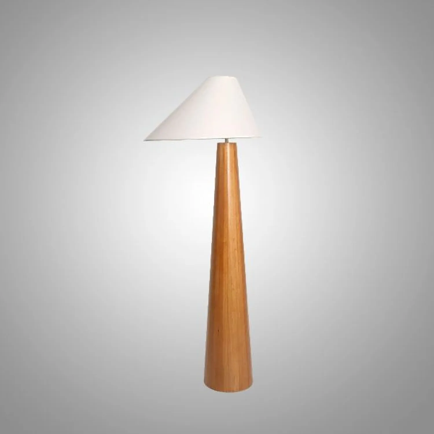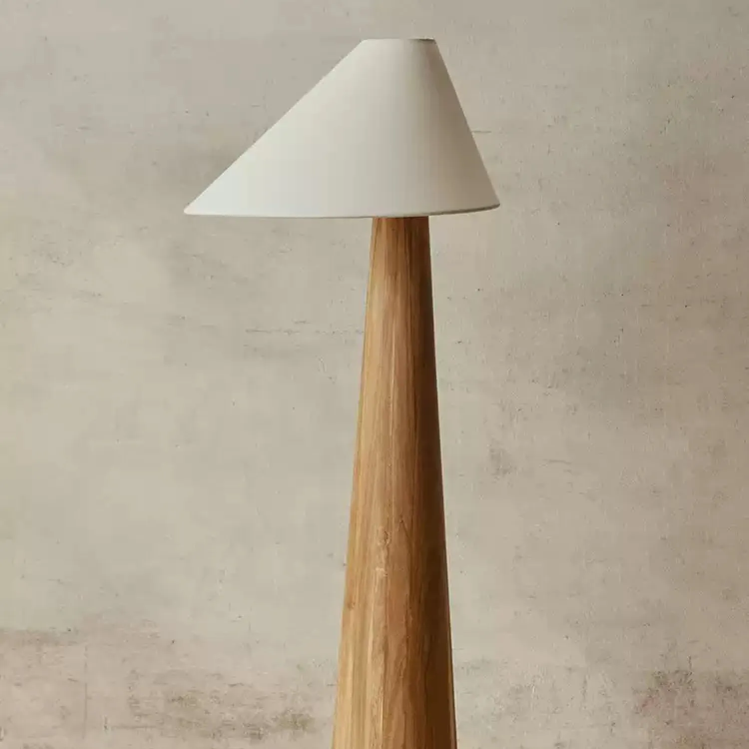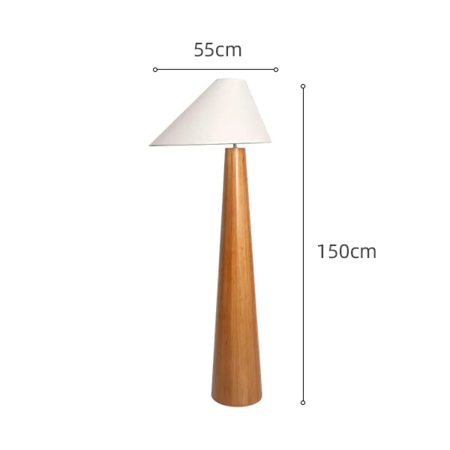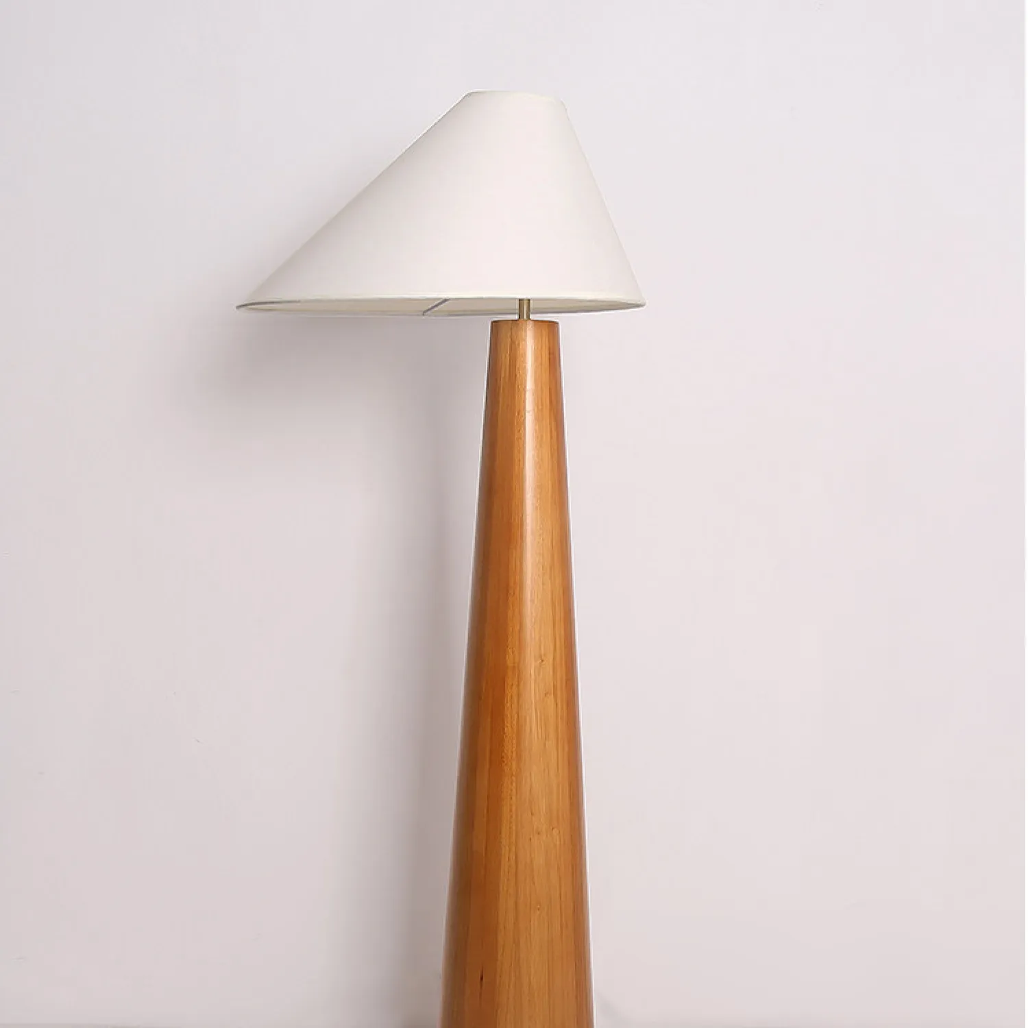 Элегантный напольный торшер с деревянным основанием и белым конусообразным абажуром. Сочетает в себе минимализм и природную эстетику, мягко рассеивает свет, создавая уютную атмосферу. Идеальный акцент для гостиной или кабинета в скандинавском стиле.