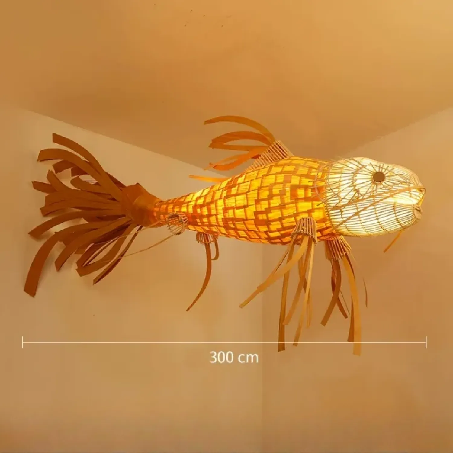 Подвесной светильник в виде объёмной рыбы, выполненный из деревянных элементов. Мягко светится изнутри, создавая уютный и необычный акцент в интерьере. Станет выразительным украшением гостиной, кафе или арт-пространства.
