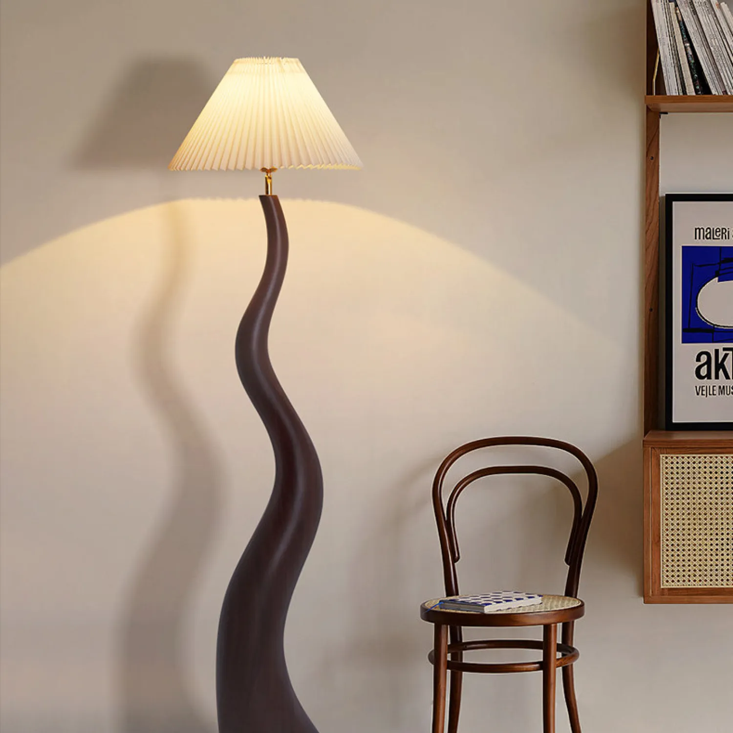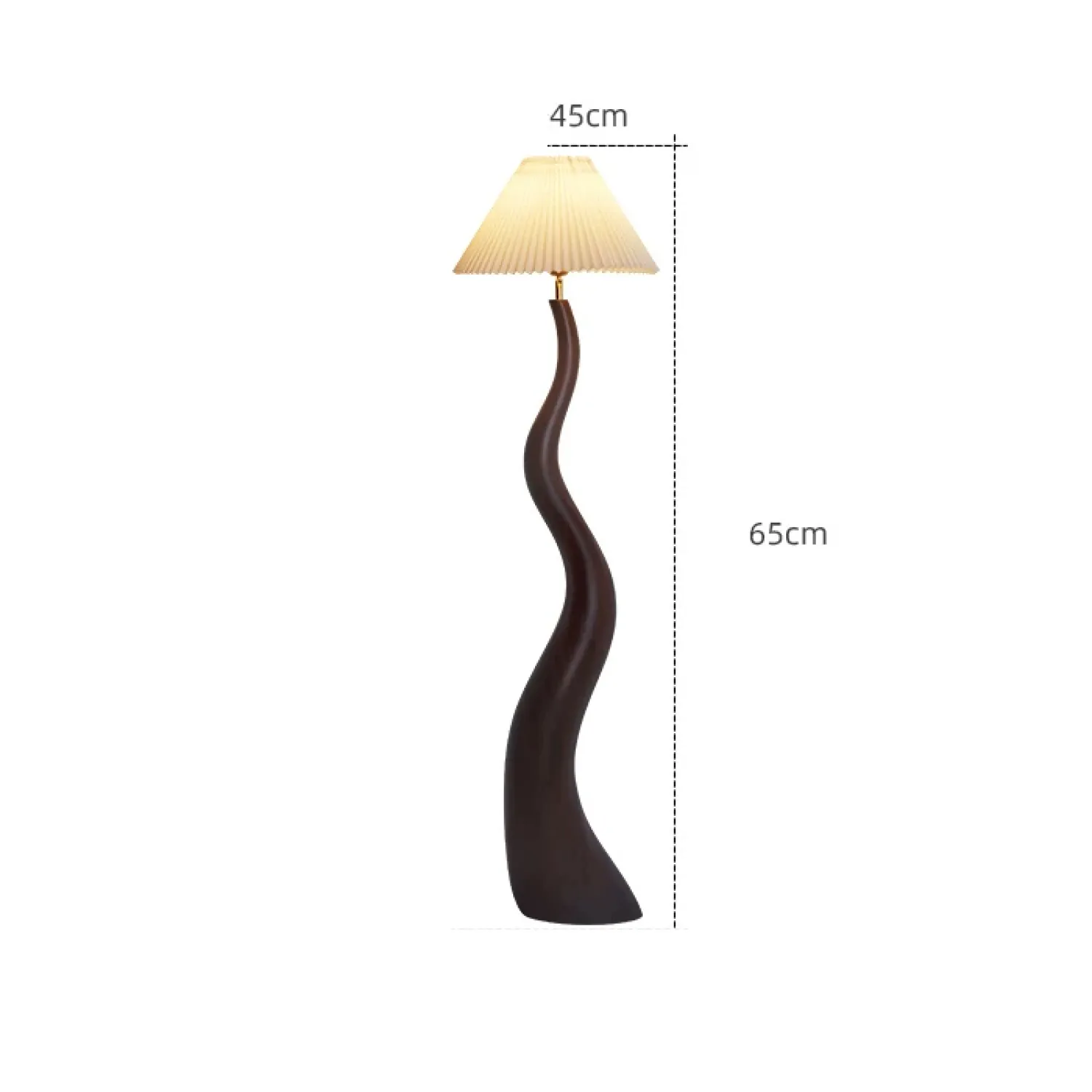 Элегантный напольный торшер с волнообразной деревянной ножкой и плиссированным абажуром. Создаёт мягкое, уютное освещение, подчёркивая современный стиль интерьера. Идеально подойдёт для гостиной, спальни или уголка для чтения. Сочетание натурального материала и изящного дизайна добавит пространству тепла и изысканности.
