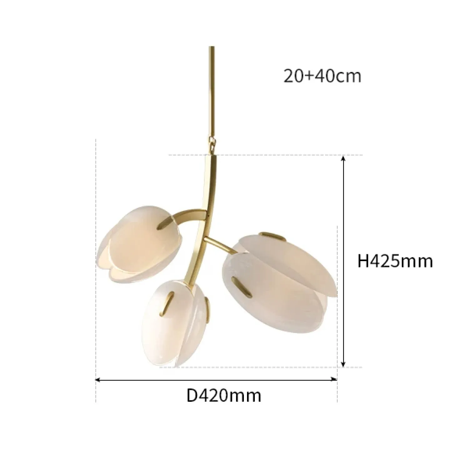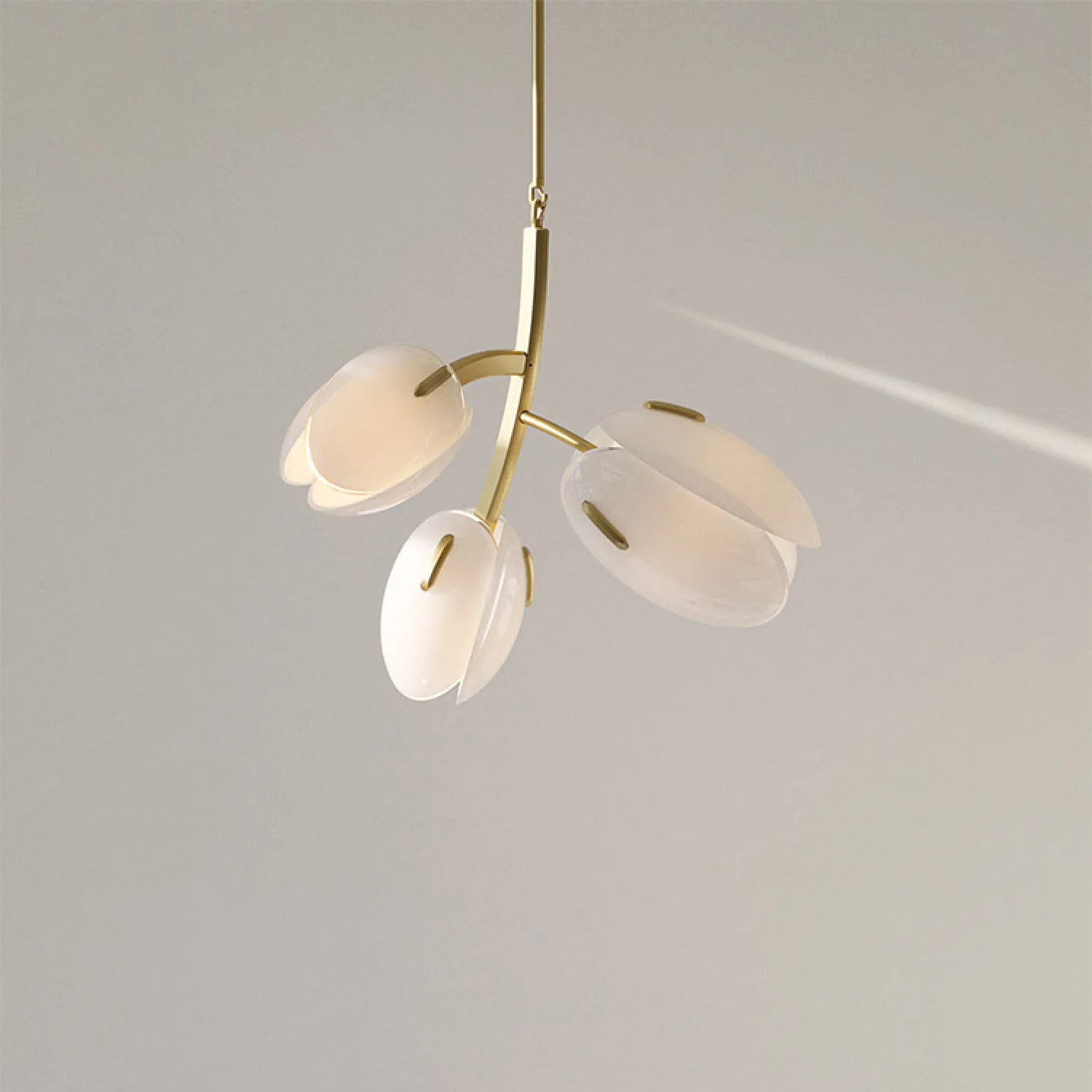 Подвесная люстра с плафонами в форме лепестков, выполненная в нежных тонах. Золотистая металлическая рама придаёт изделию элегантность. Создаёт мягкий, рассеянный свет, формируя уютную атмосферу. Отлично подойдёт для спальни или гостиной.