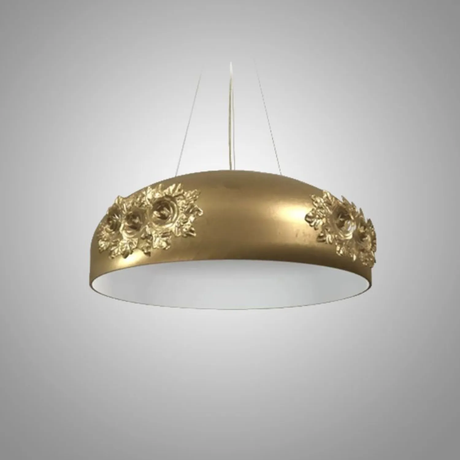 Элегантный подвесной светильник с полусферическим абажуром светлого или золотого оттенка. Украшен объёмными цветочными элементами, которые придают изделию изысканность и утончённость. Создаёт мягкий, уютный свет, идеально подходящий для гостиной или столовой. Лаконичный, но выразительный дизайн станет стильным акцентом в интерьере.