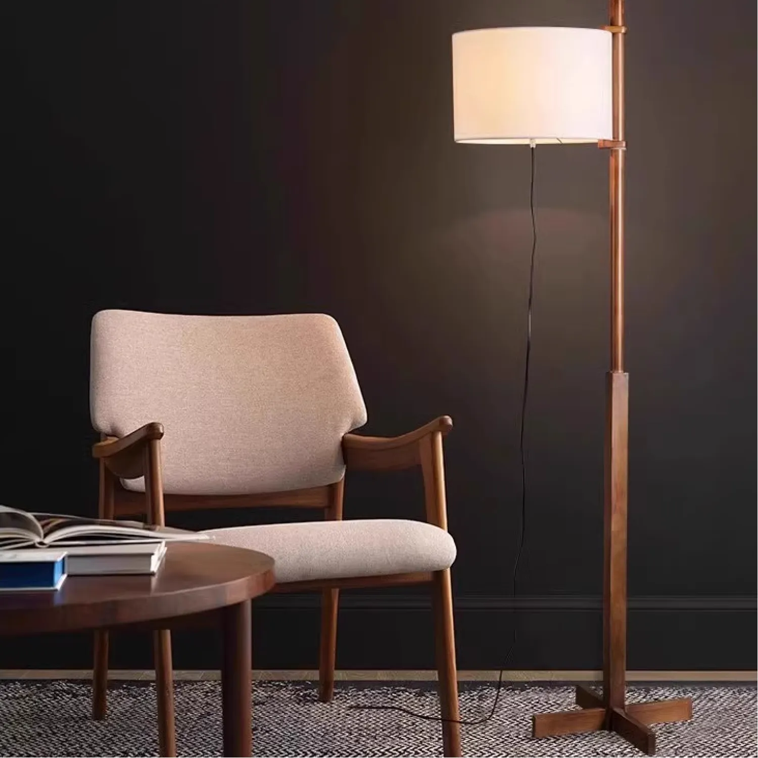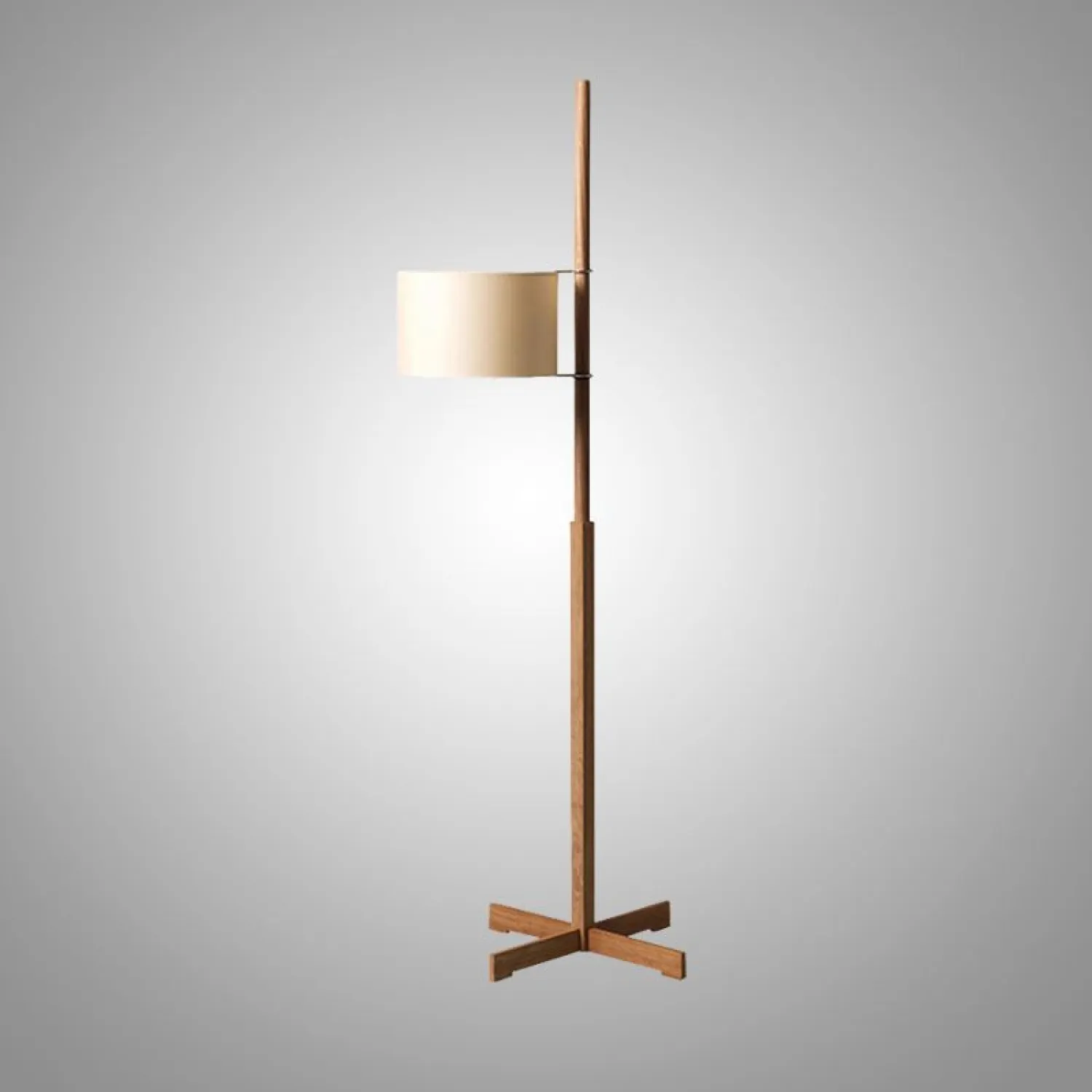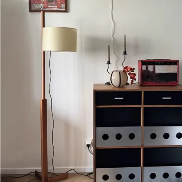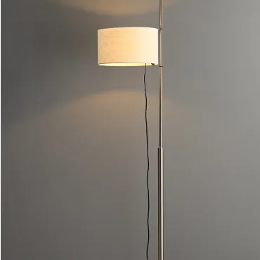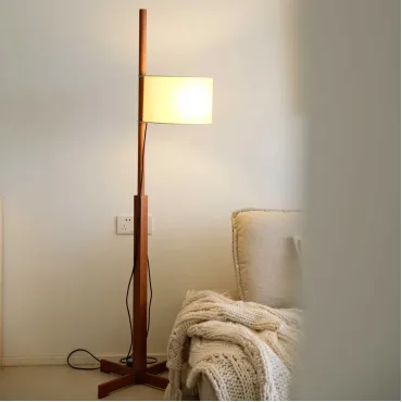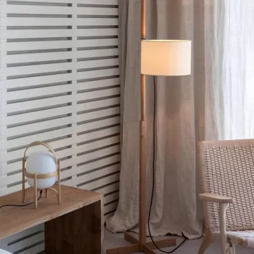 Элегантный торшер в минималистичном стиле с цилиндрическим абажуром из светлой ткани. Деревянная стойка лаконичной формы дополнена круглой основой, обеспечивающей устойчивость. Создаёт мягкий, рассеянный свет, идеально подходящий для гостиной или зоны отдыха. Сочетает функциональность и современный дизайн.