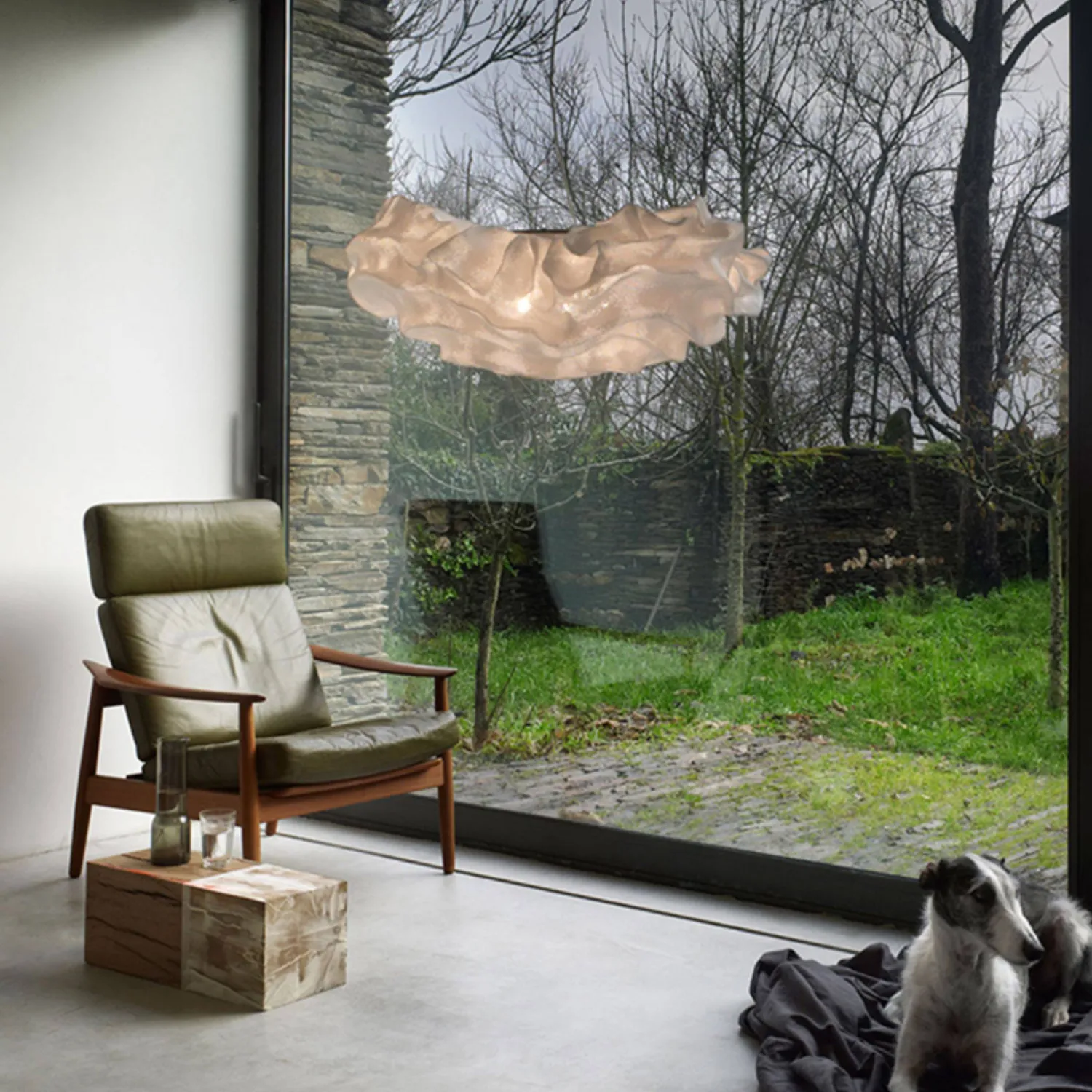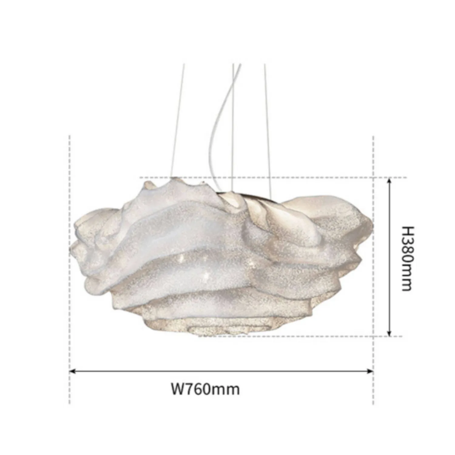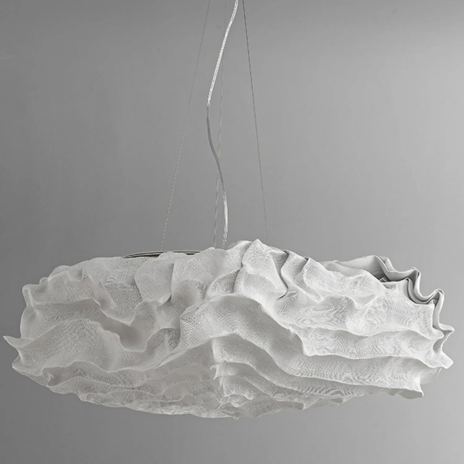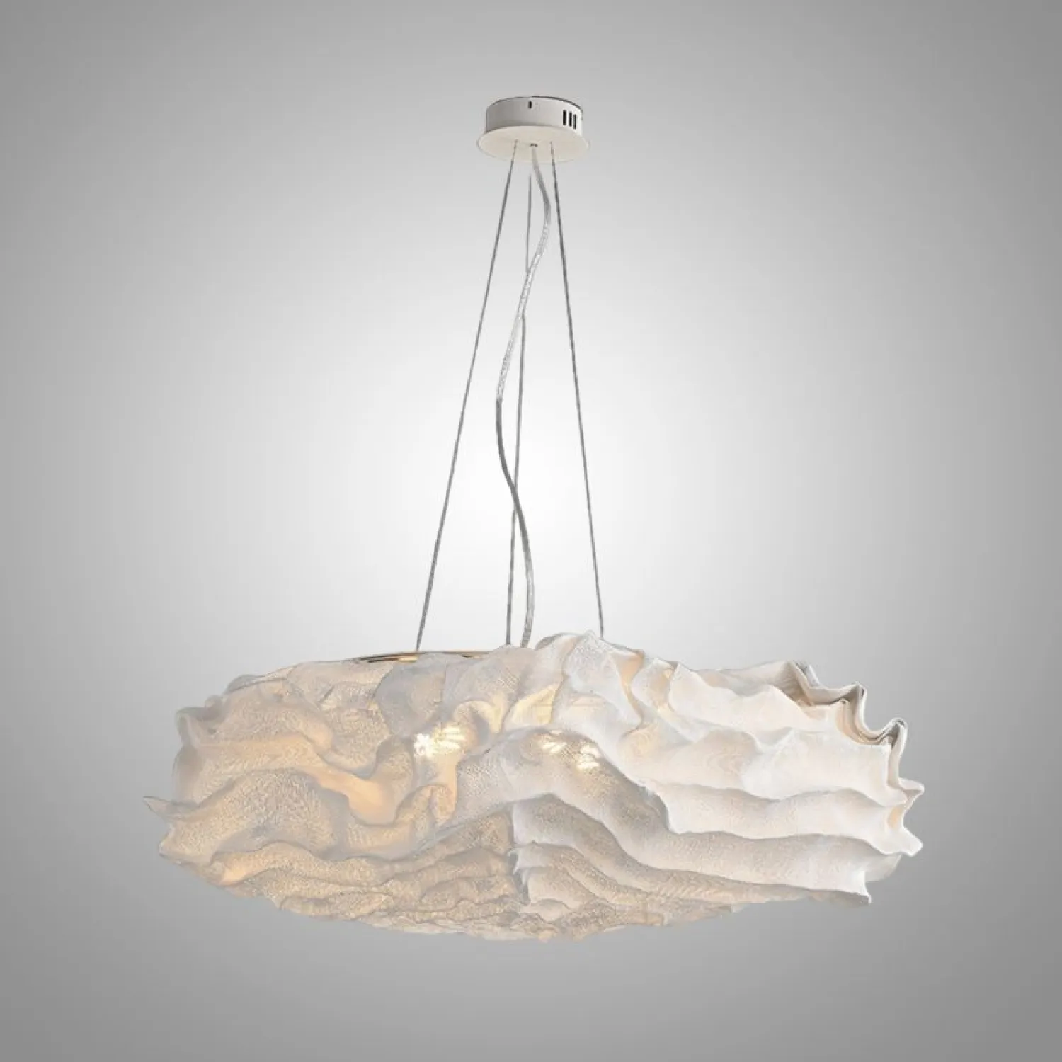 Элегантная подвесная люстра из нержавеющей стали с оригинальным дизайном в виде объёмного «облака» из текстурированного материала. Крепится к потолку на трёх тонких тросах, создавая лёгкую и воздушную композицию. Мягкий рассеянный свет делает её идеальным акцентом для гостиной или столовой в современном стиле.