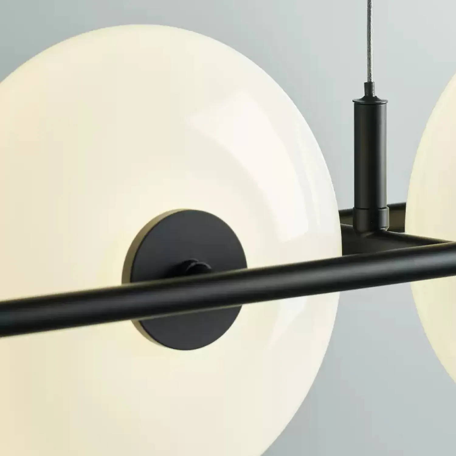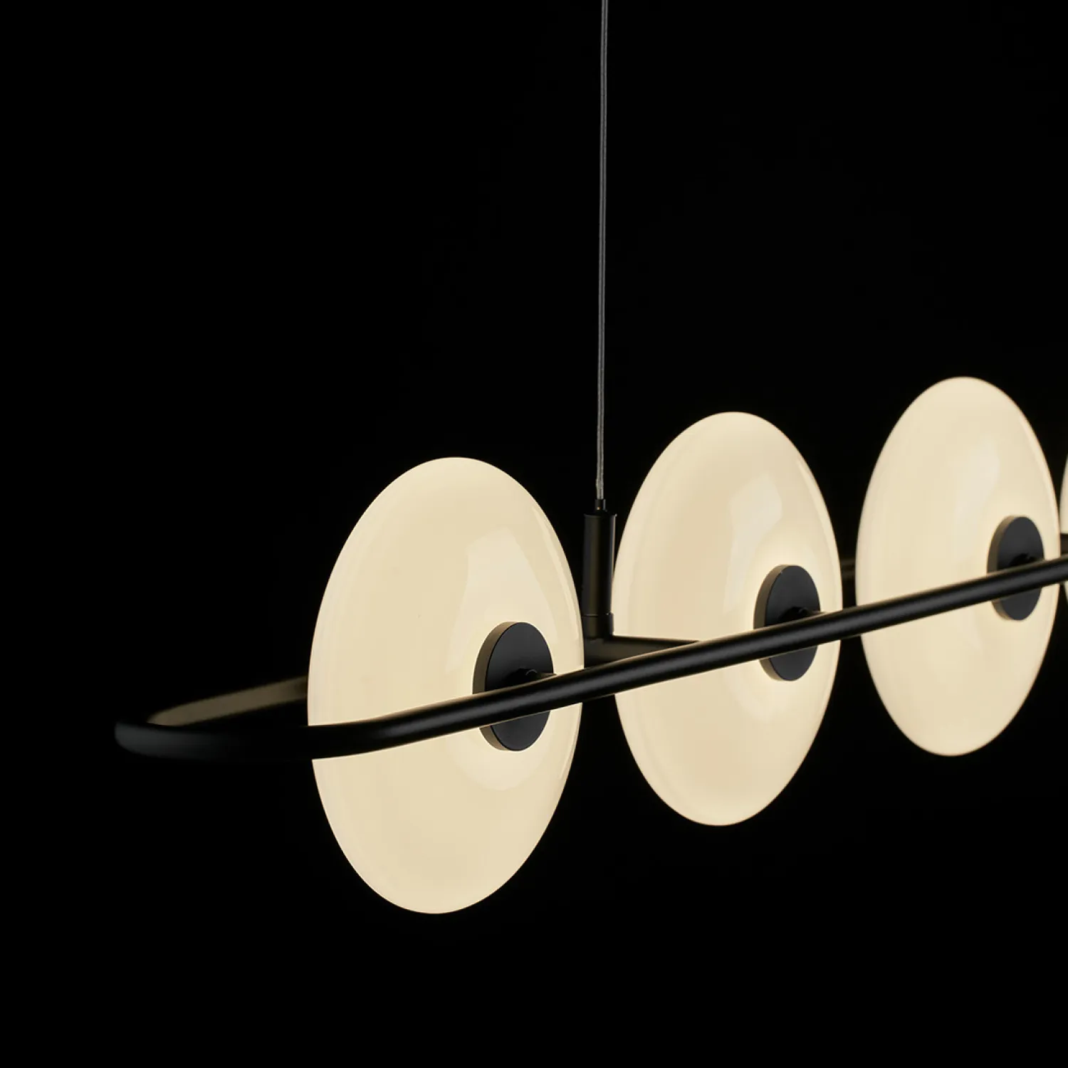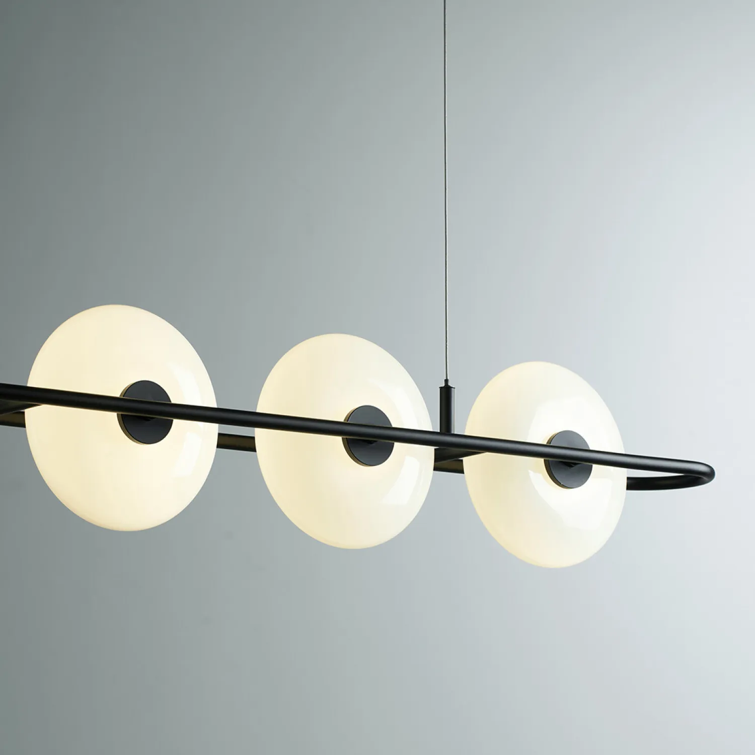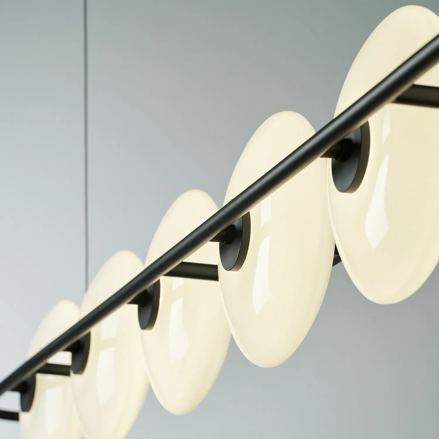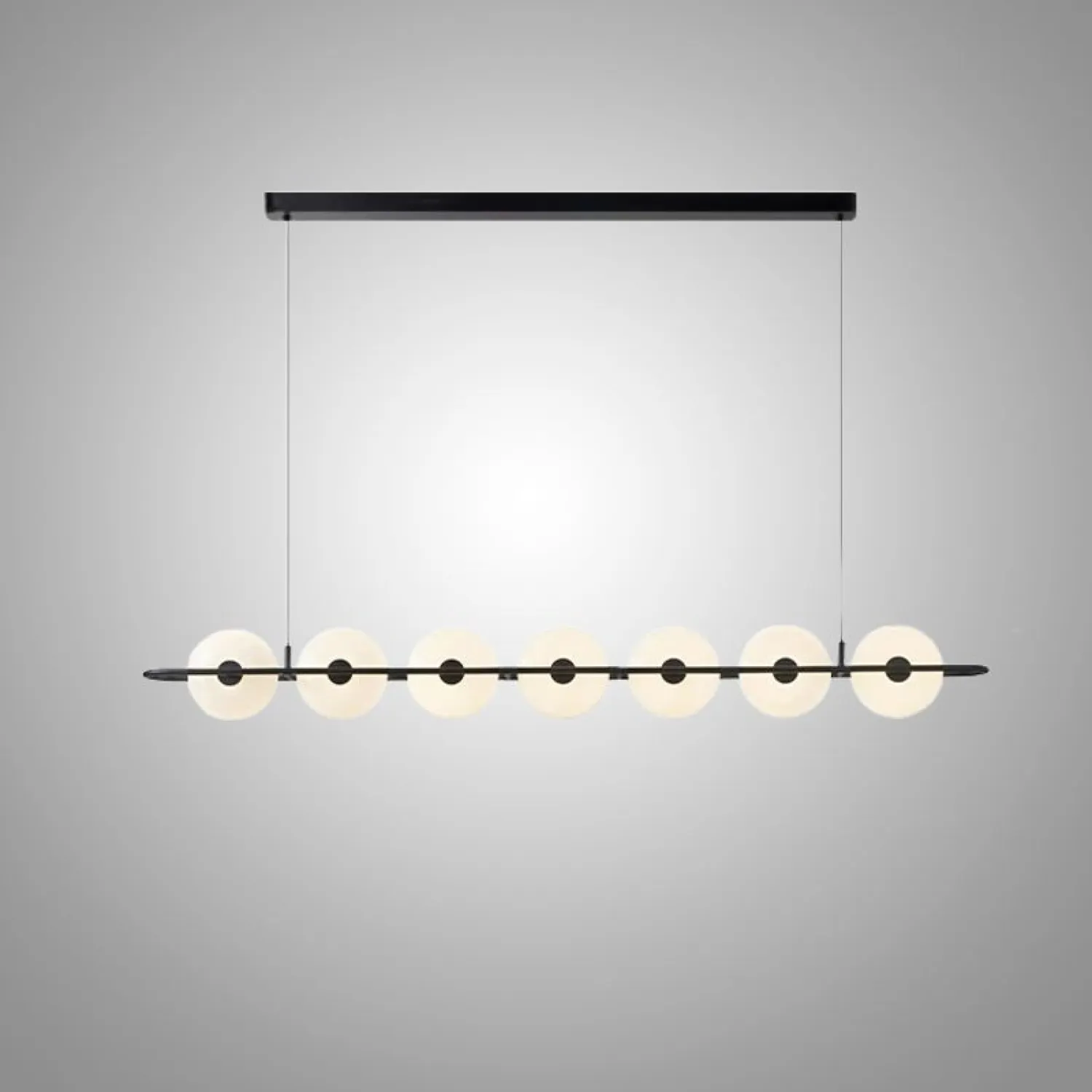 Подвесной светильник от ZUI Lighting — образец современного минимализма. Конструкция состоит из горизонтальной металлической планки с круглыми матовыми плафонами, равномерно расположенными вдоль неё. Создаёт мягкий, равномерный свет, подчёркивая лаконичность интерьера. Отлично подойдёт для столовой или гостиной зоны, добавляя пространству стильный акцент.