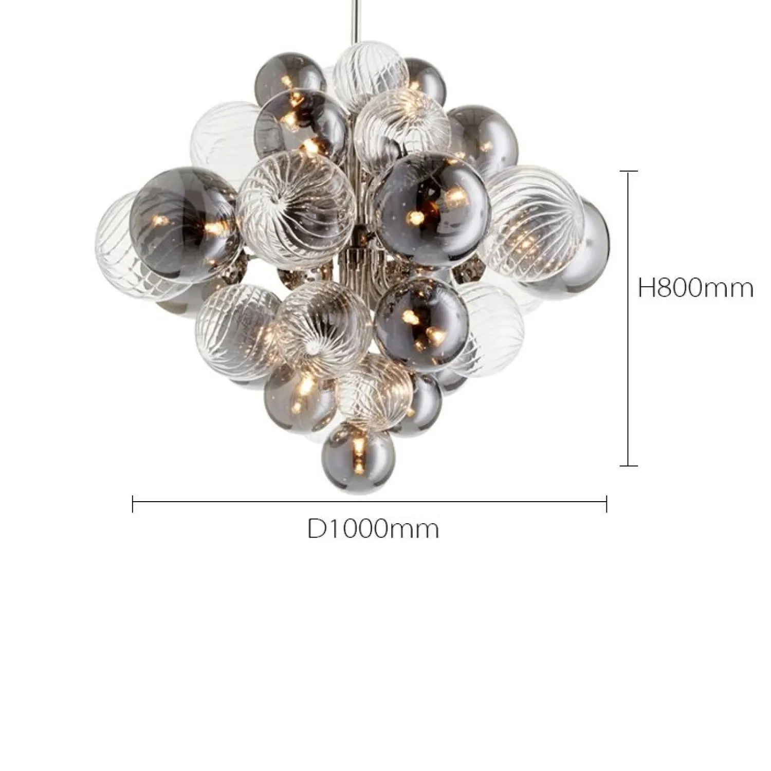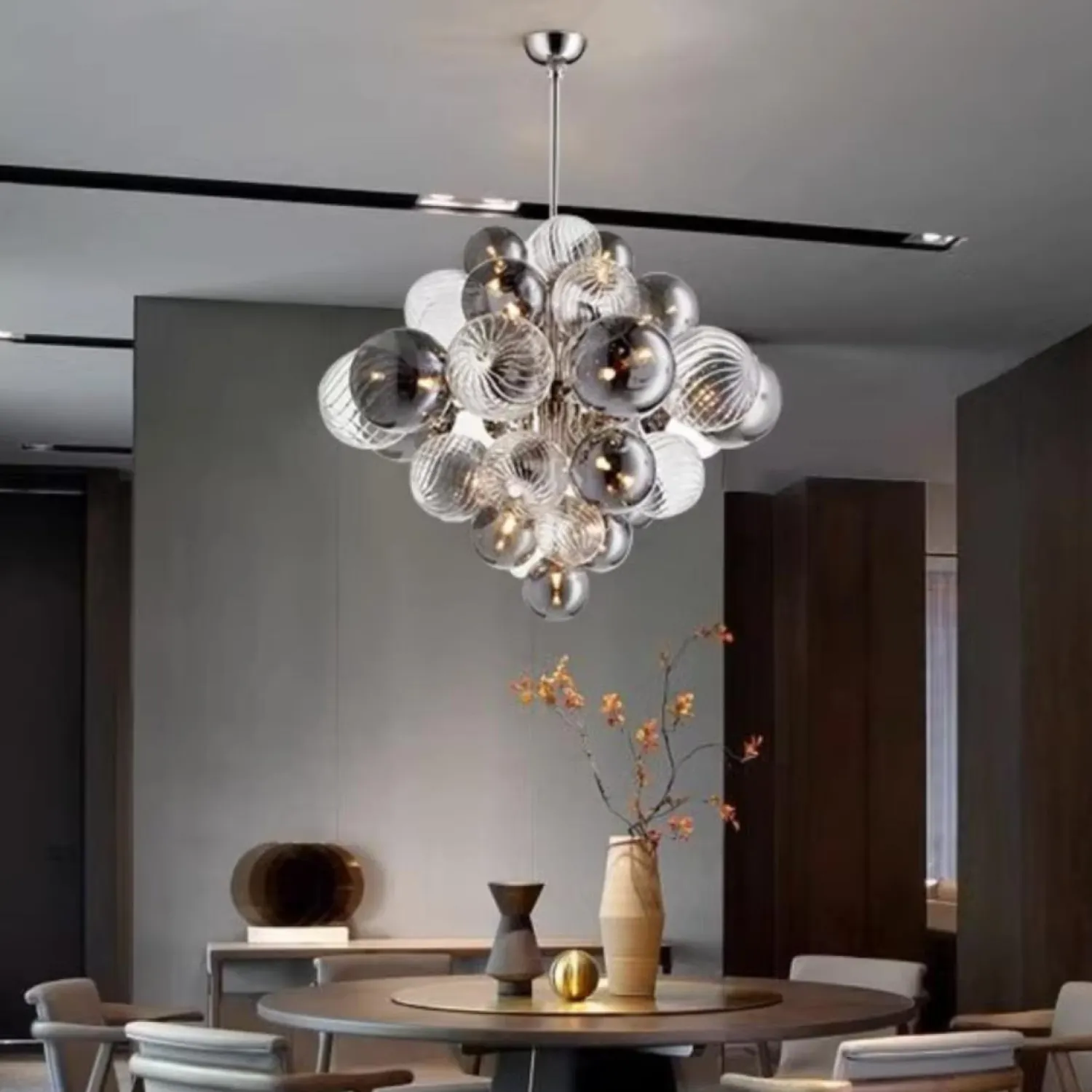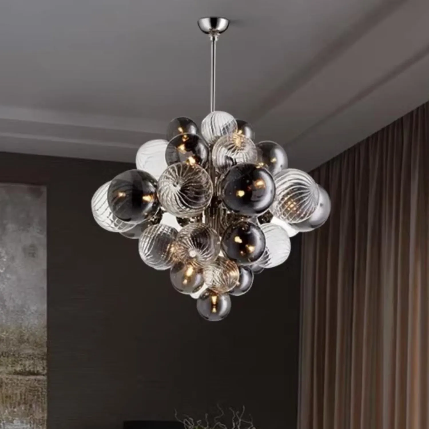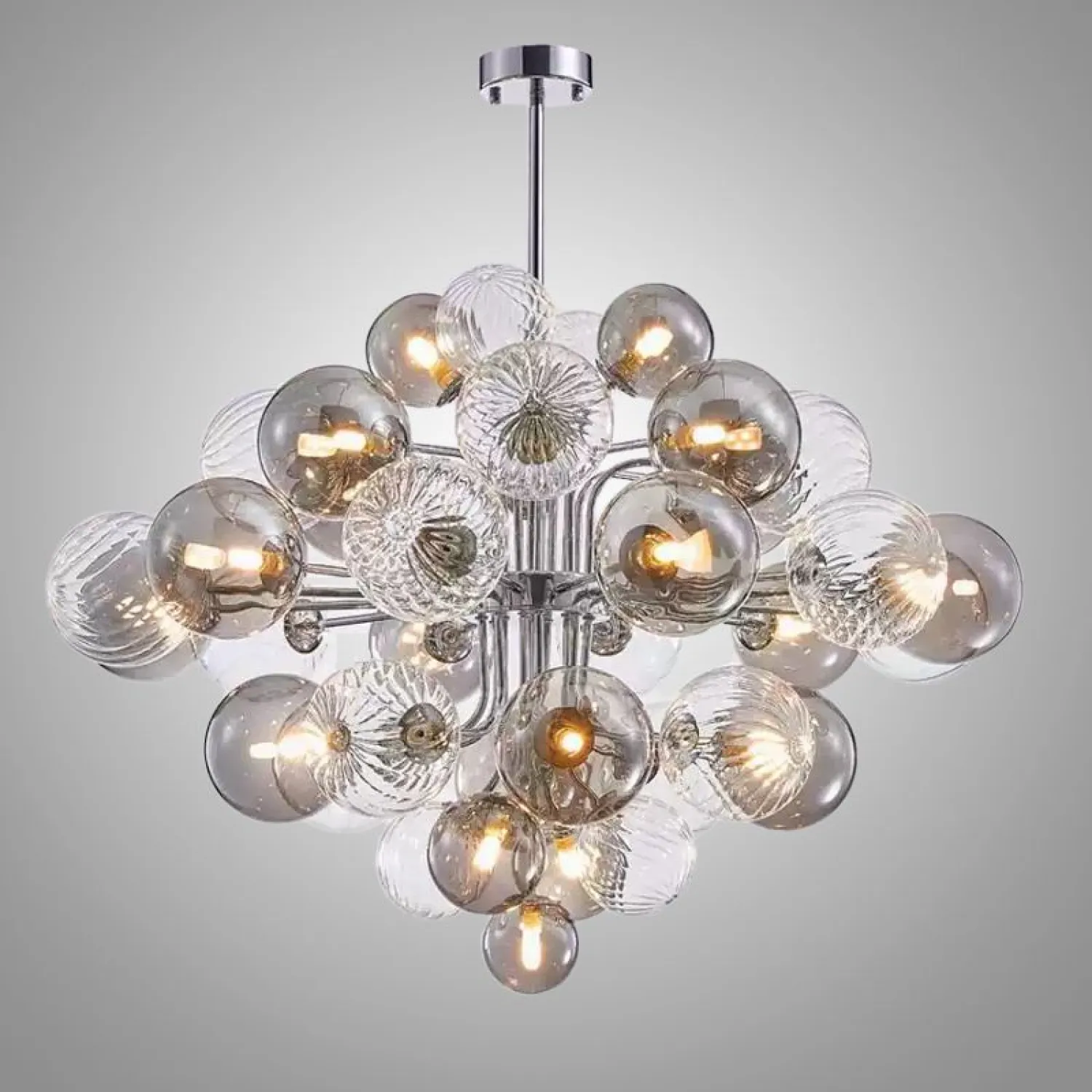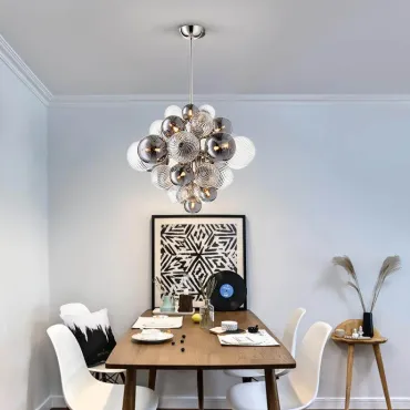 Элегантная люстра с шарообразными элементами из дымчатого и прозрачного стекла. Сочетает глянцевые и текстурированные поверхности, создаёт изысканные световые переливы. Современный дизайн, объёмная композиция — эффектный акцент для гостиной или зала.