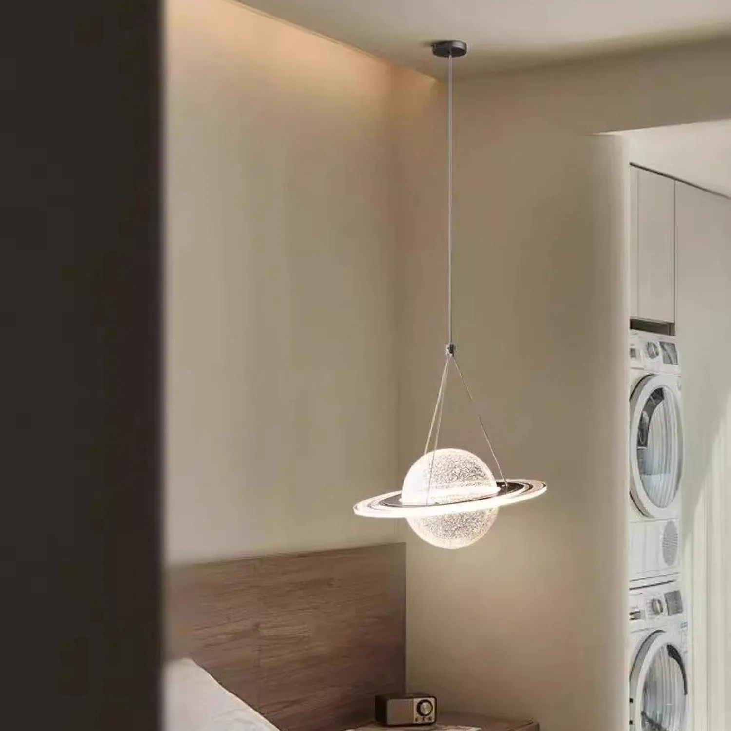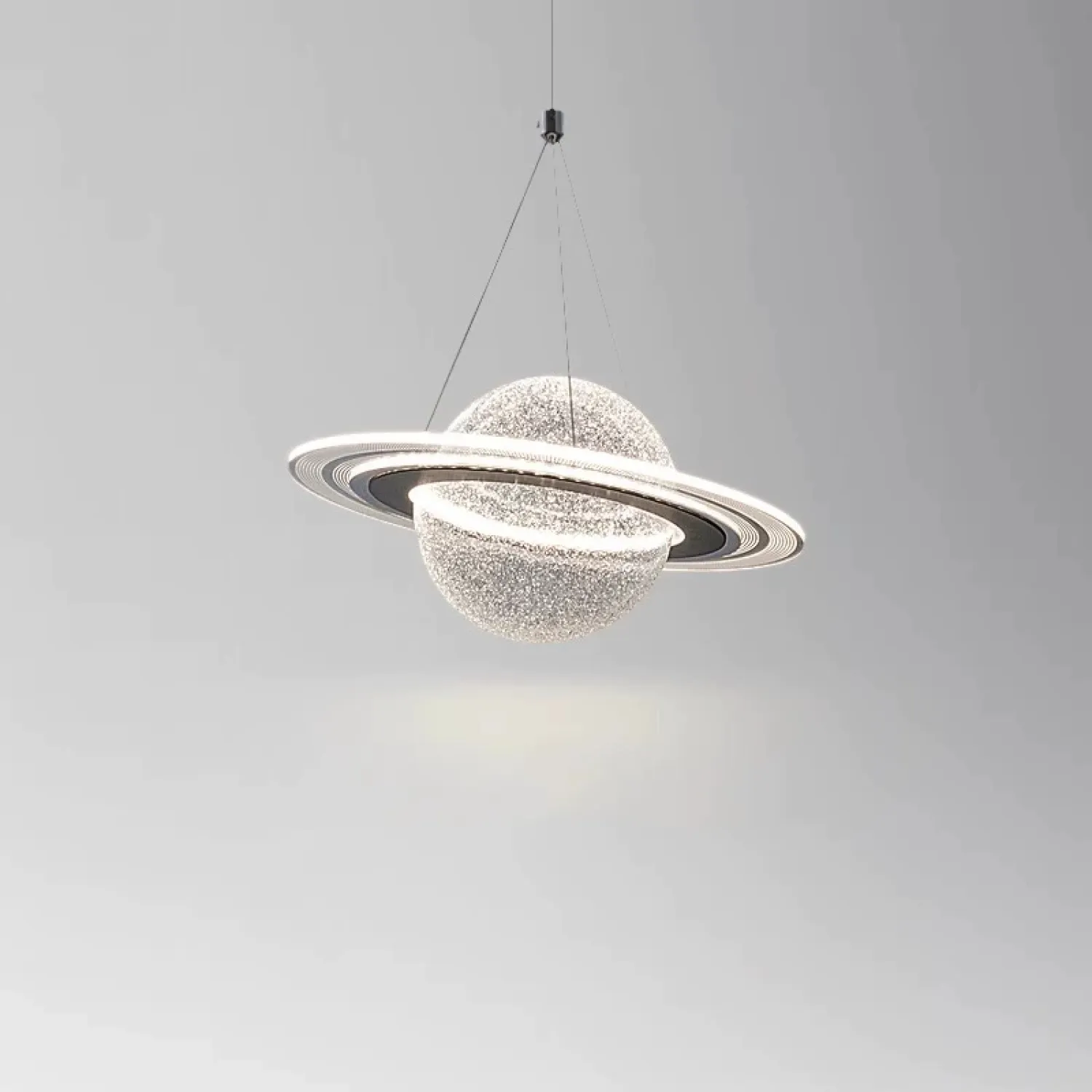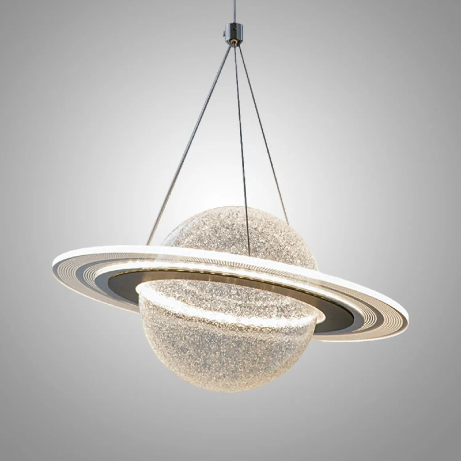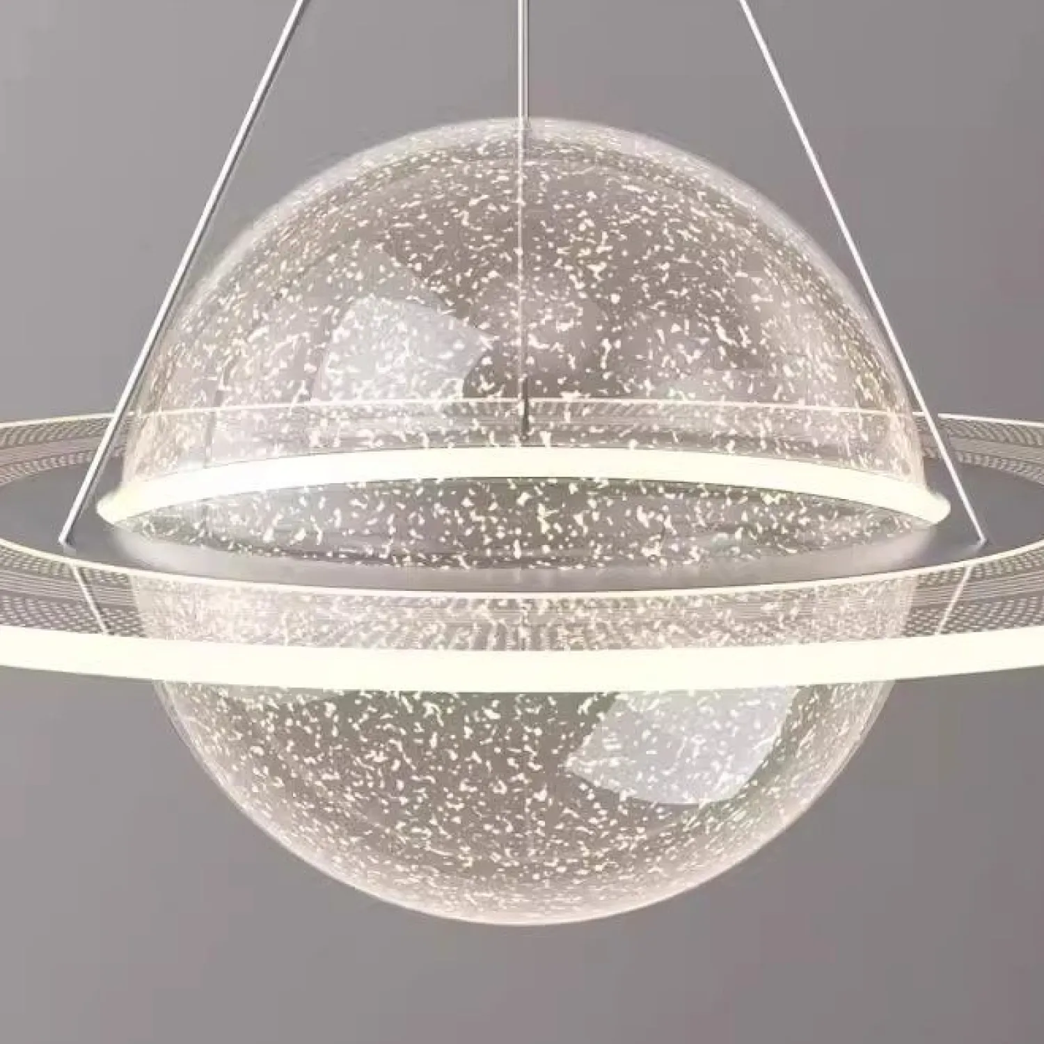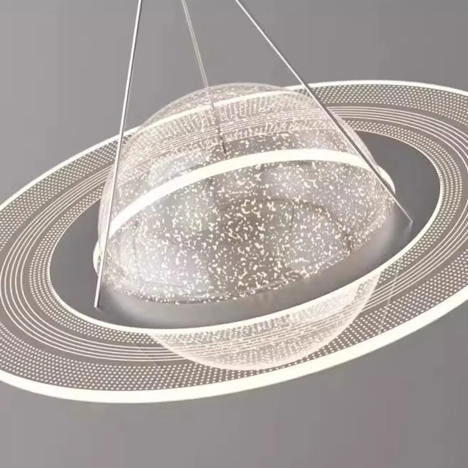 Элегантный настенный светильник в космическом стиле, в форме планеты из акрила. Выполнен в светлых тонах с золотистой вставкой, создаёт мягкий рассеянный свет. Станет стильным акцентом в минималистичном интерьере — идеально подойдёт для прихожей или зоны отдыха.