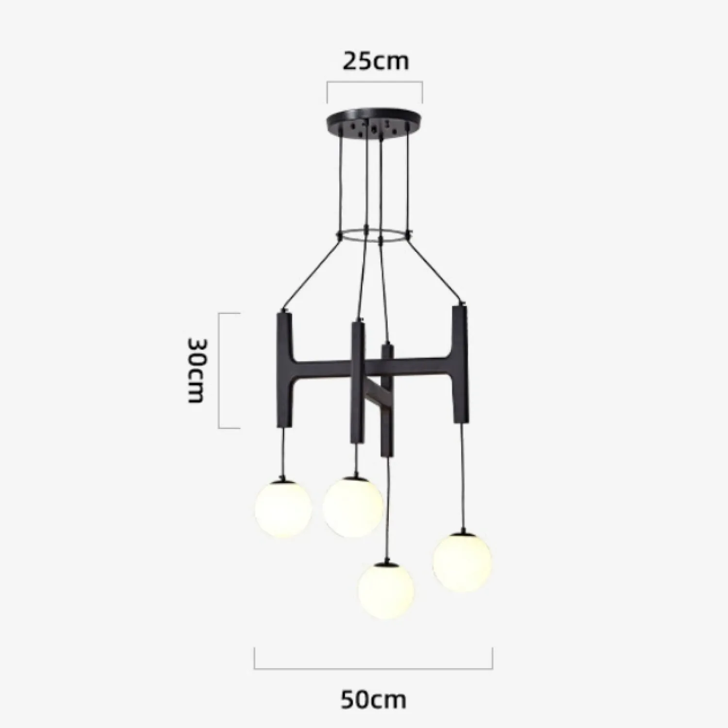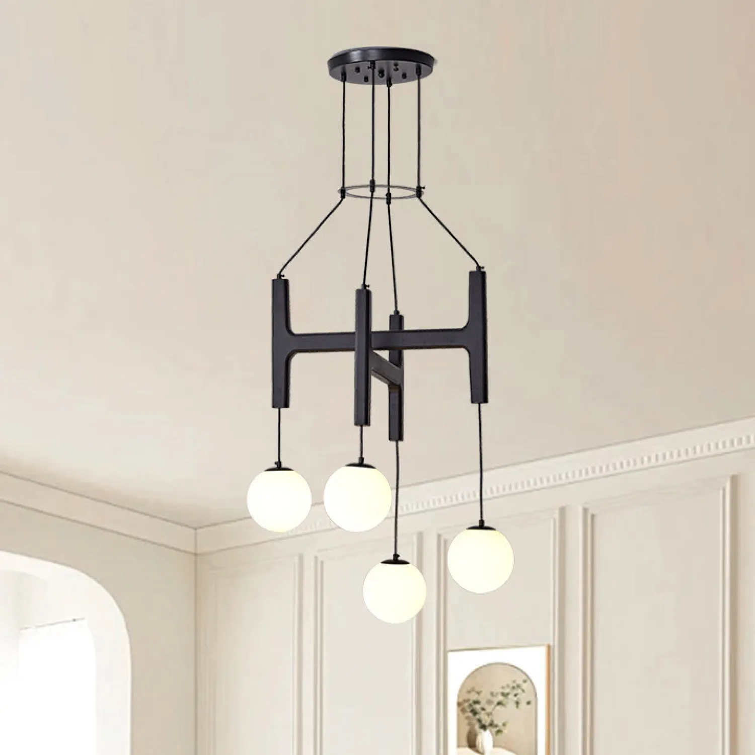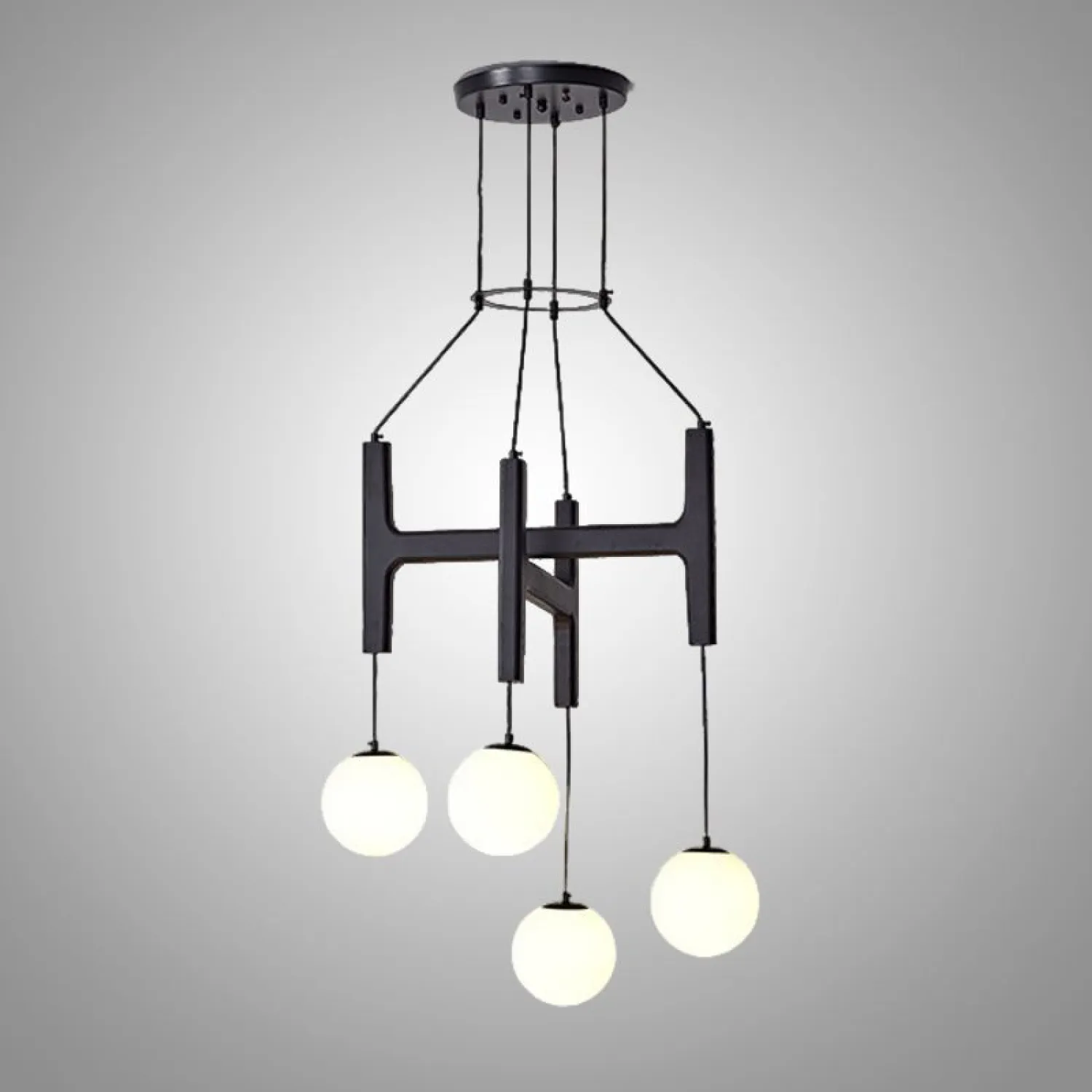Современная люстра с геометрическим дизайном станет выразительным акцентом в интерьере. Конструкция выполнена в виде стильной H-образной рамы из тёмного дерева, к которой на тонких шнурах подвешены матовые стеклянные шары. Мягкий рассеянный свет создаёт уютную атмосферу, а лаконичные формы подчёркивают минималистичный стиль помещения. Идеально подойдёт для гостиной, столовой или зоны отдыха.