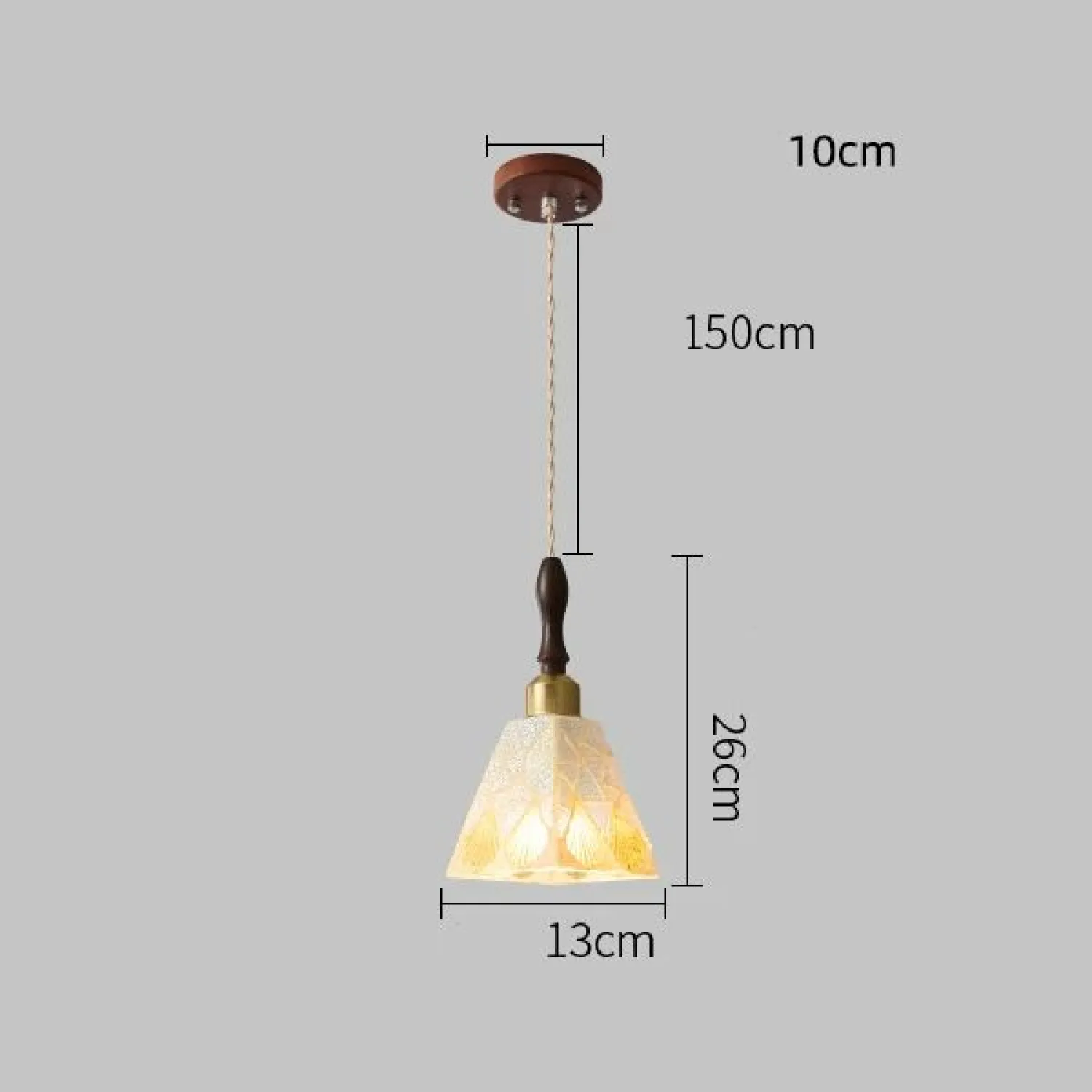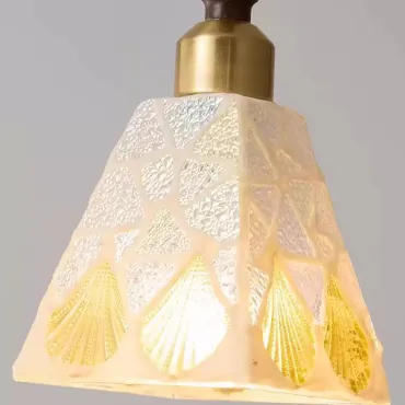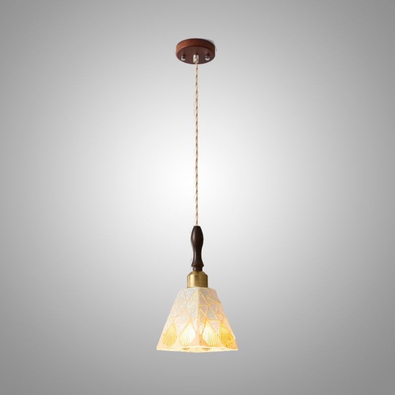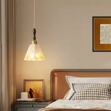 Элегантный подвесной светильник сочетает в себе лаконичность и изысканность. Его плафон в форме усечённого конуса украшен нежным растительным орнаментом, который красиво преломляет свет. Основание выполнено из тёмного дерева, а крепление — в тёплых коричневых тонах, что придаёт изделию уют и гармонию. Идеальный выбор для кухни, столовой или гостиной в стиле модерн или эко.