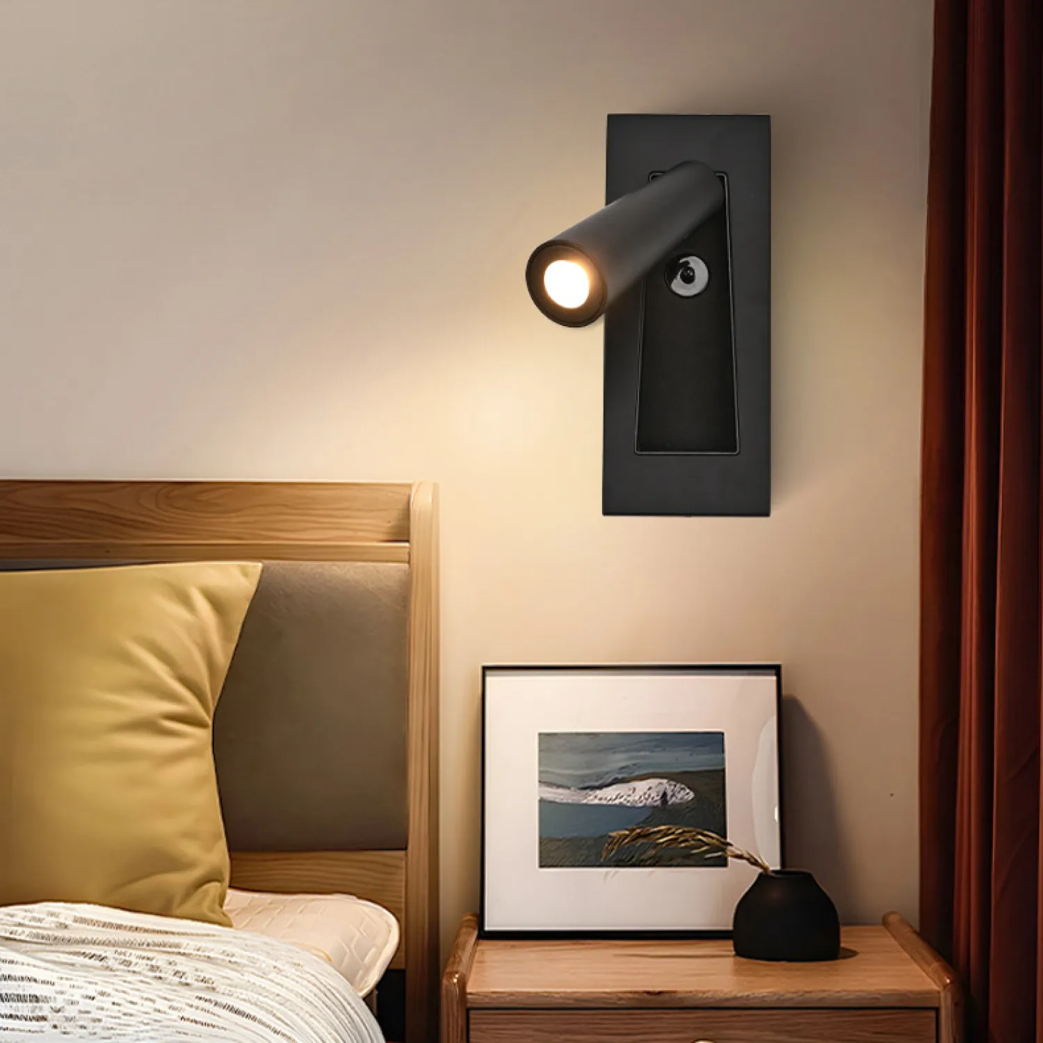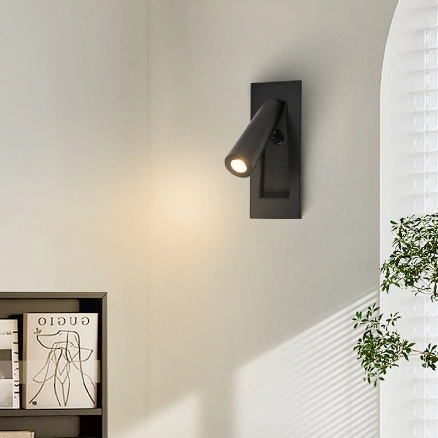 Стильный настенный светильник в современном дизайне. Компактная конструкция с поворотным плафоном позволяет регулировать направление света — идеально для чтения или акцентного освещения. Лаконичная прямоугольная основа гармонично впишется в любой интерьер.