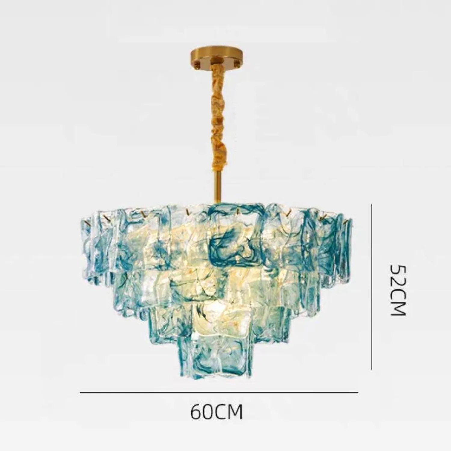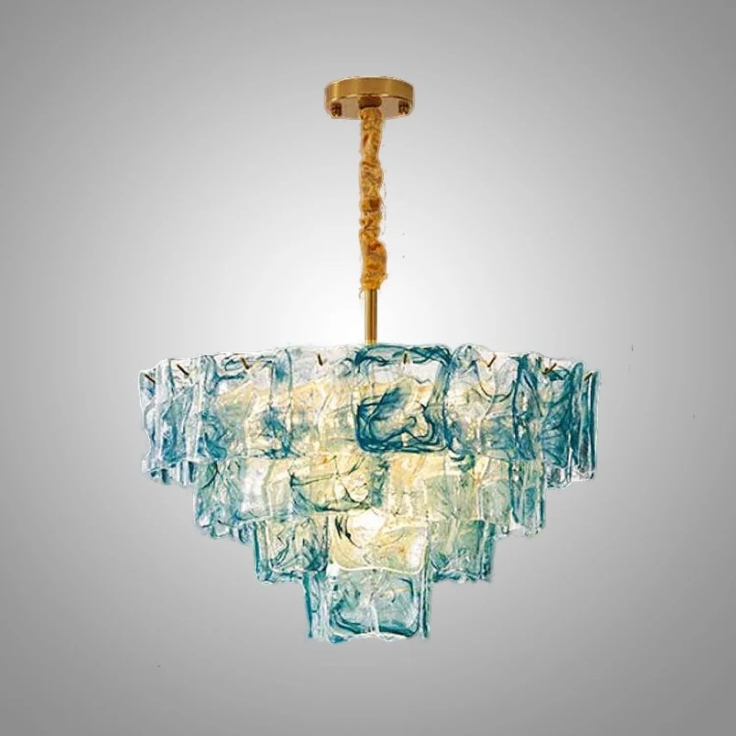 Винтажная люстра из стекла поражает изысканностью и оригинальностью дизайна. Многоярусная конструкция собрана из полупрозрачных стеклянных элементов с выразительными, напоминающими мраморные разводы. Золотистая цепь и крепёж добавляют изделию нотку классического шарма. Люстра станет эффектным акцентом в гостиной или столовой, наполняя пространство мягким, рассеянным светом.