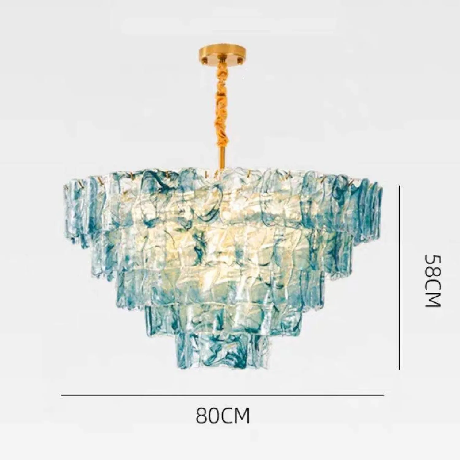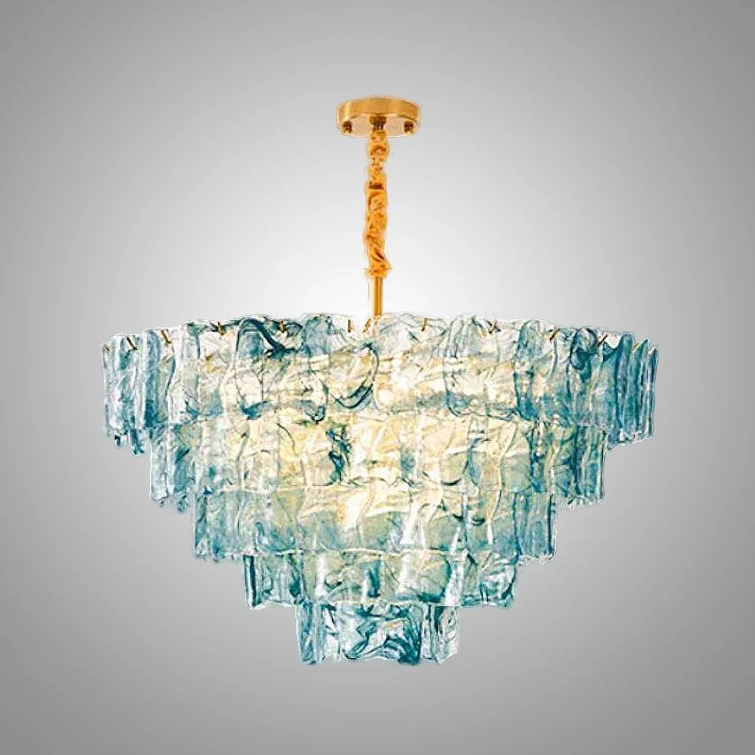 Винтажная люстра из стекла поражает изысканностью и оригинальностью дизайна. Многоярусная конструкция собрана из полупрозрачных стеклянных элементов с выразительными, напоминающими мраморные разводы. Золотистая цепь и крепёж добавляют изделию нотку классического шарма. Люстра станет эффектным акцентом в гостиной или столовой, наполняя пространство мягким, рассеянным светом.