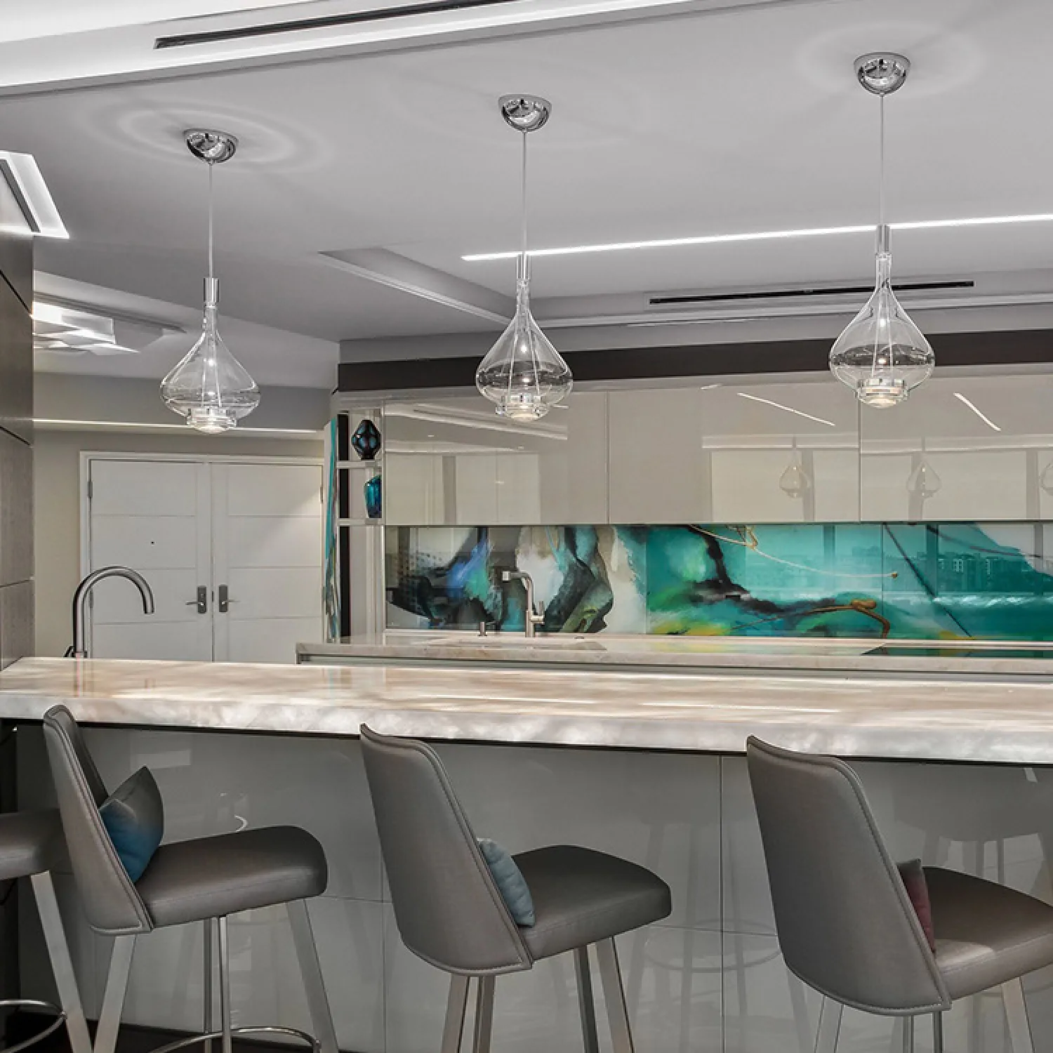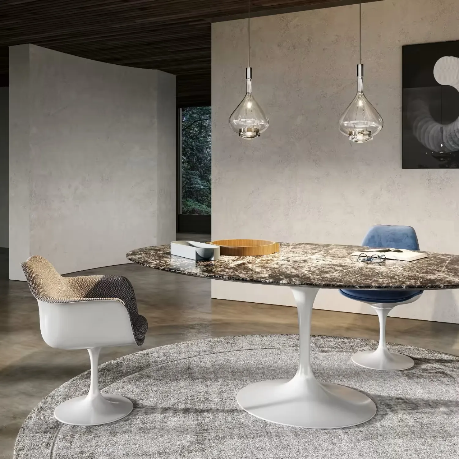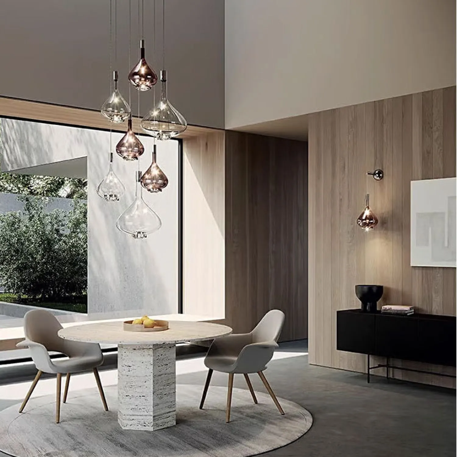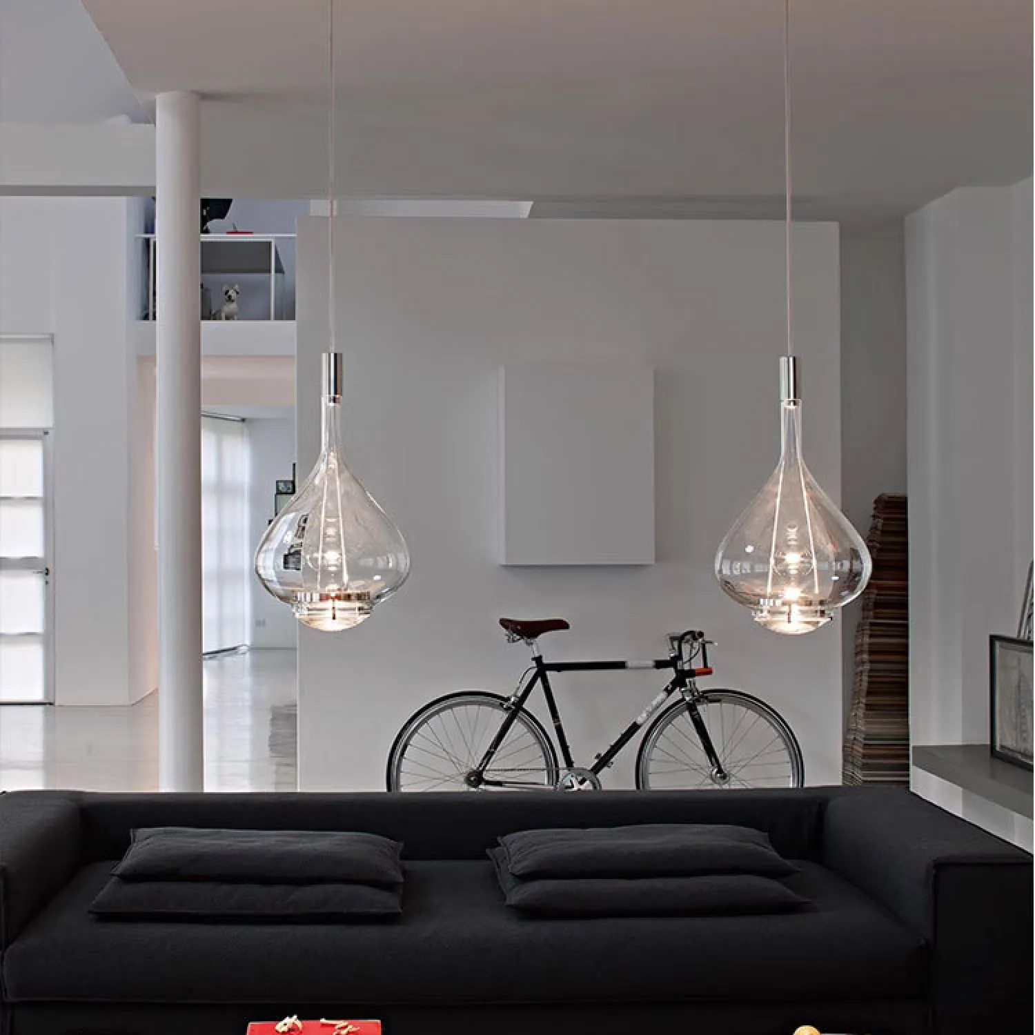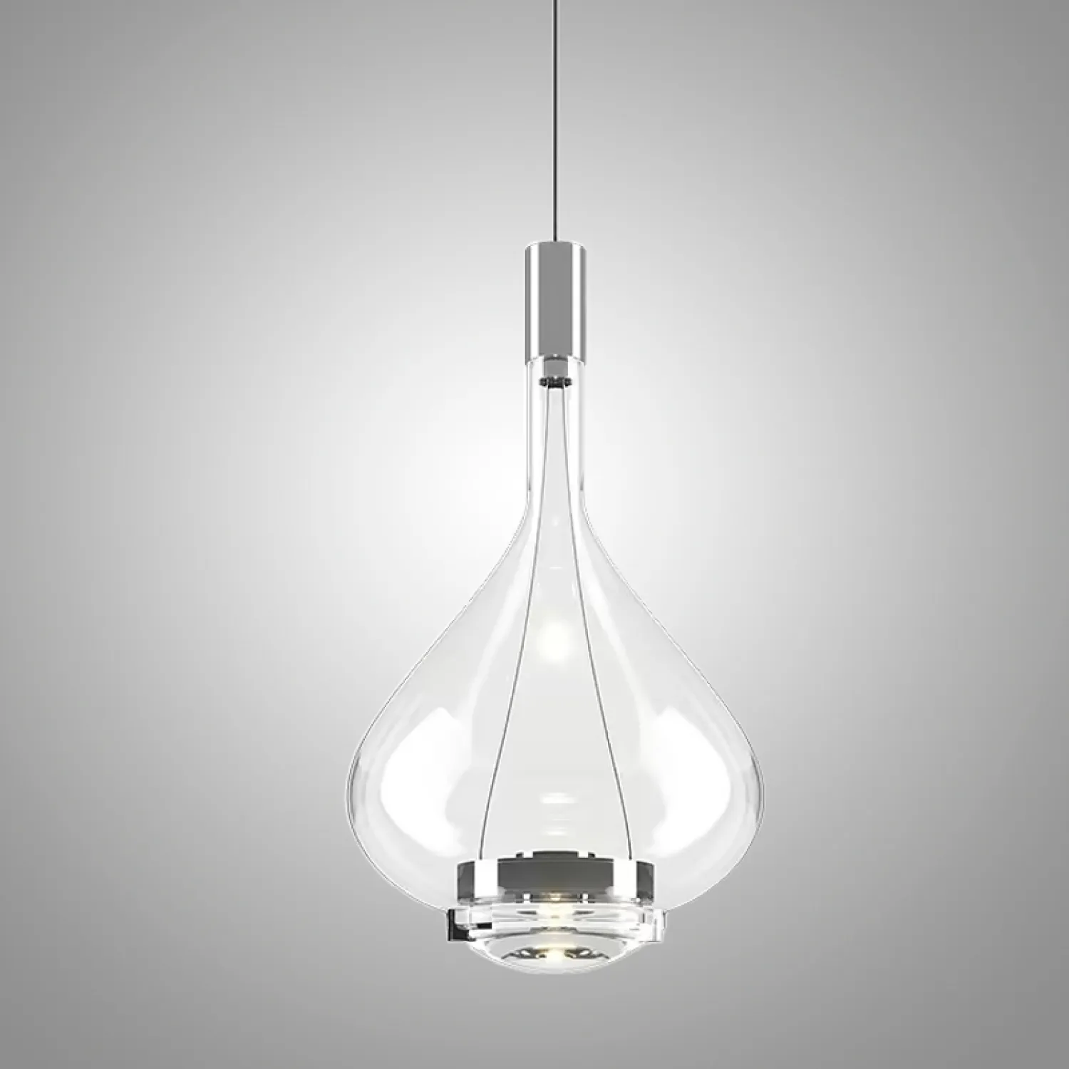 Подвесной светильник состоит из металлического основания и абажура из дутого стекла. Свет равномерно рассеивается через абажур и проходит через изогнутую линзу, расположенную внизу, создавая направленный поток. Задняя часть светильника регулируется.