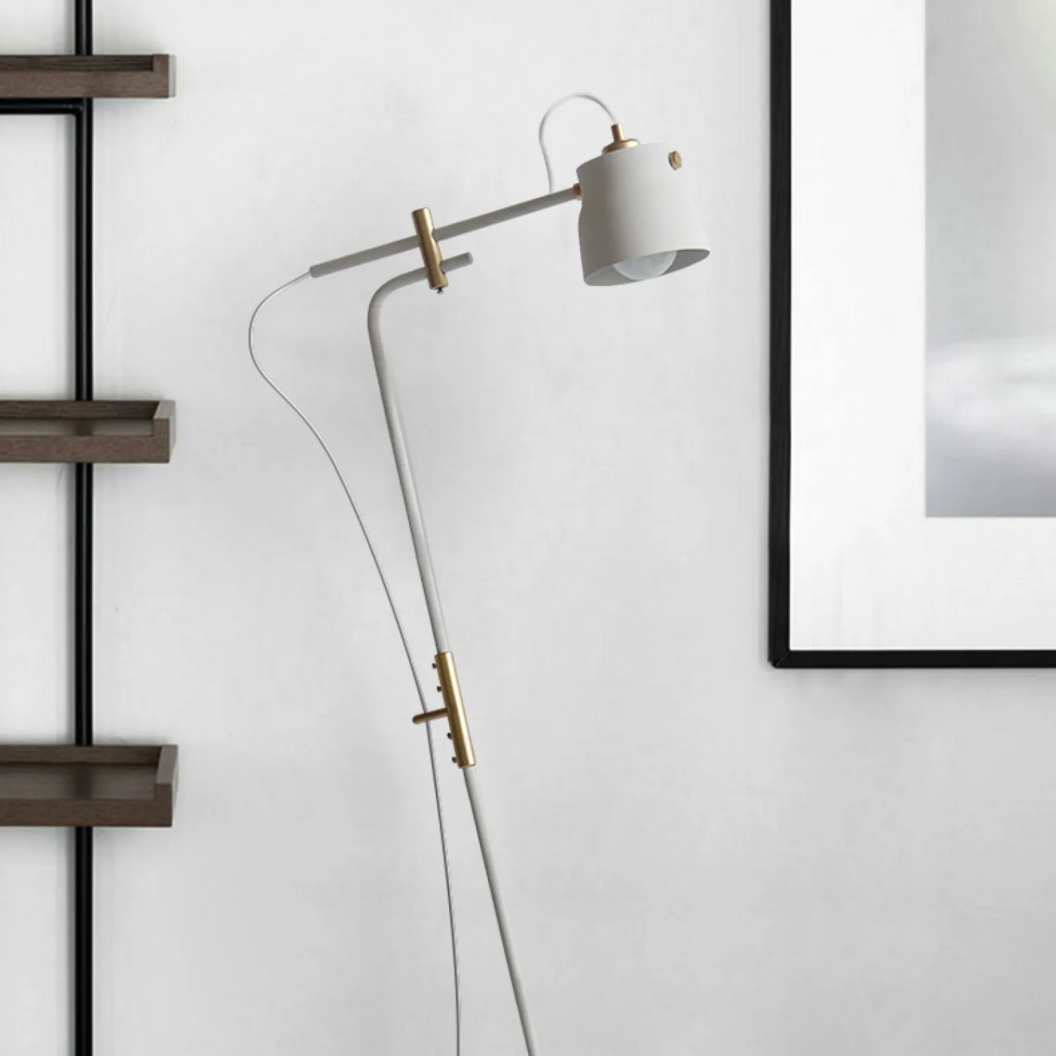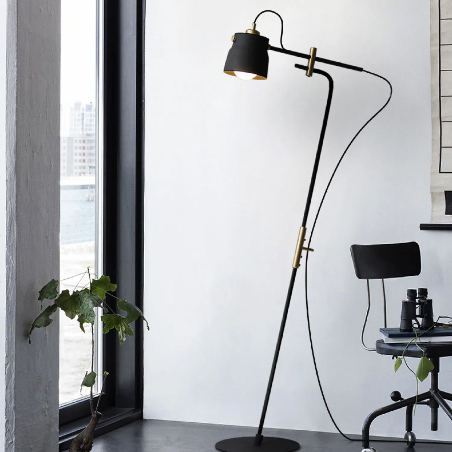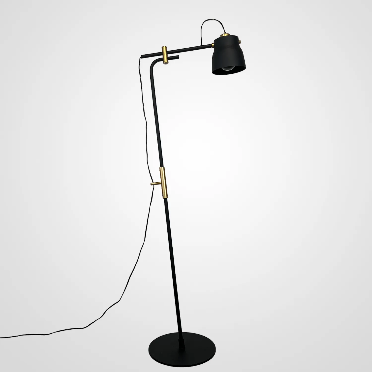 Дизайнерский торшер в индустриальном стиле на каркасе черного или белого цветов и вставками латунного цвета. Большая опорная поверхность и продуманный наклон стойки позволяют достичь максимальной устойчивости всей конструкции и делают эту модель универсальной для многих интерьерных решений. Используйте торшер вместе с люстрой RAM или светильниками этой же серии, чтобы гарантированно создать единый стиль освещения в вашем помещении не ломая при этом голову.