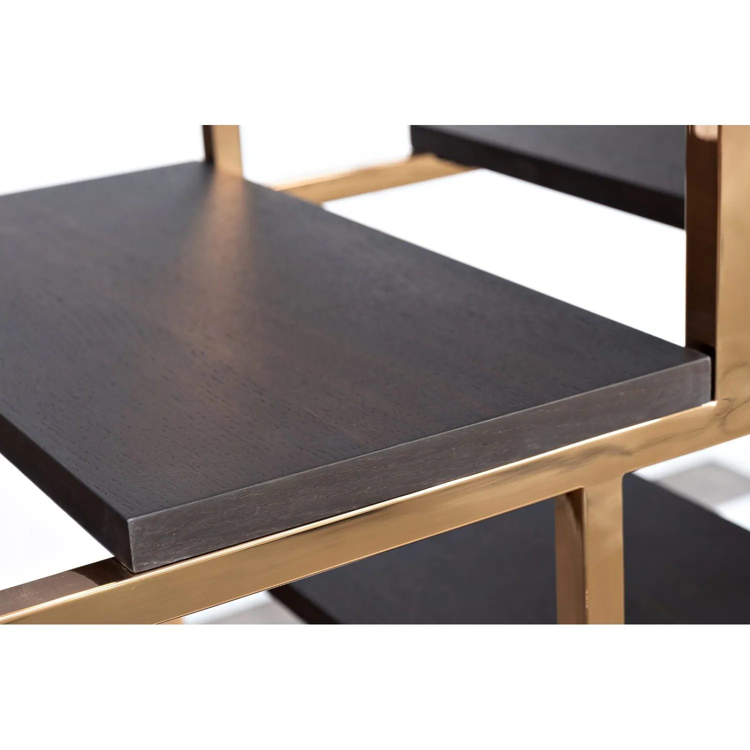 Изготовленный из прочного и качественного материала, стеллаж-полусфера обладает надежной конструкцией, которая гарантирует его долговечность и стабильность. Розовое золото и темный шпон создают элегантное сочетание, которое привлекает внимание и придает уникальность этому предмету мебели.