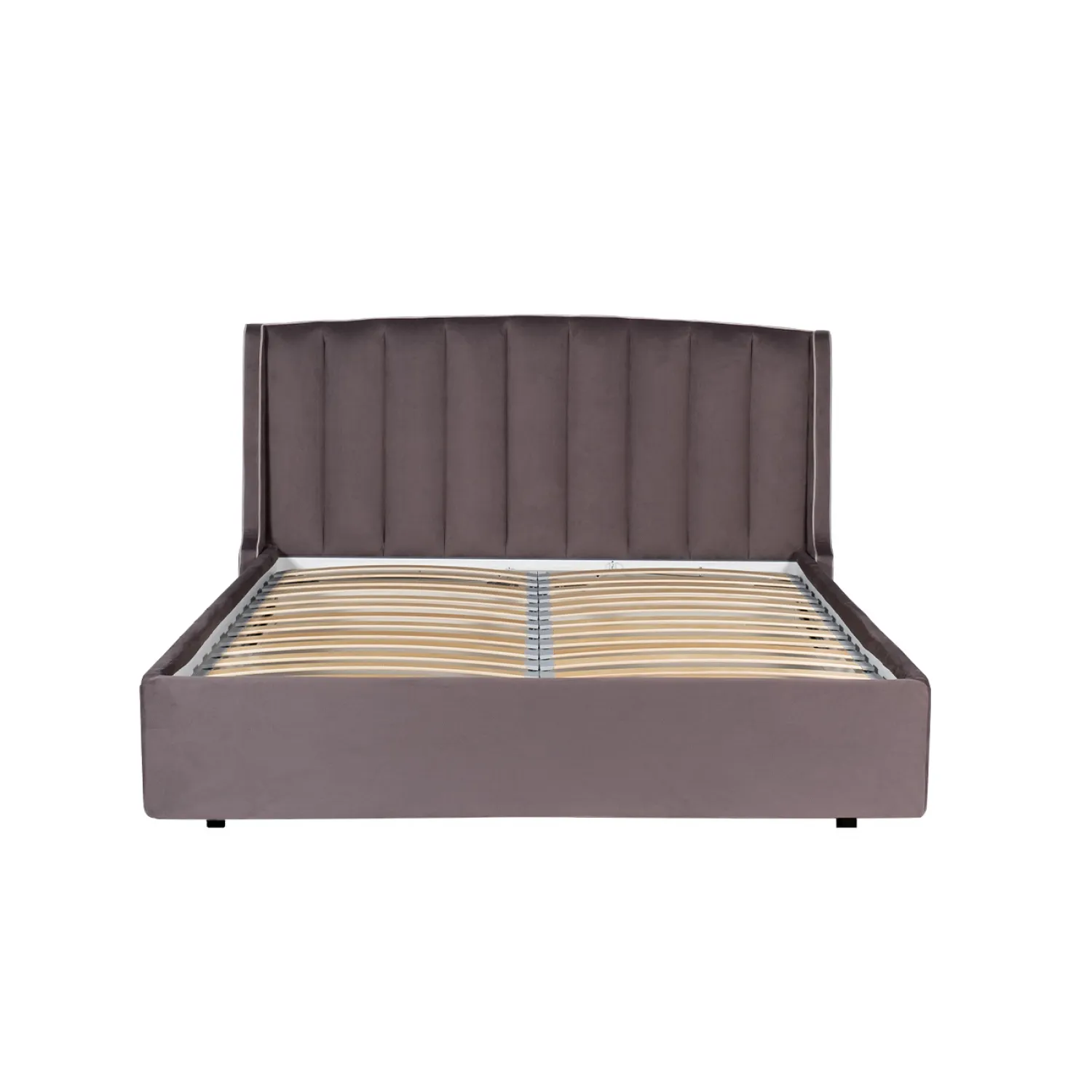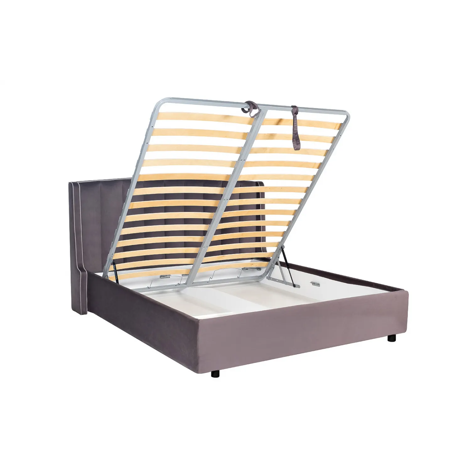 Кровать выполнена из высококачественных материалов, которые гарантируют ее долговечность и надежность. Велюровая обивка в лилово-сером цвете придает кровати изысканный вид и приятный на ощупь.