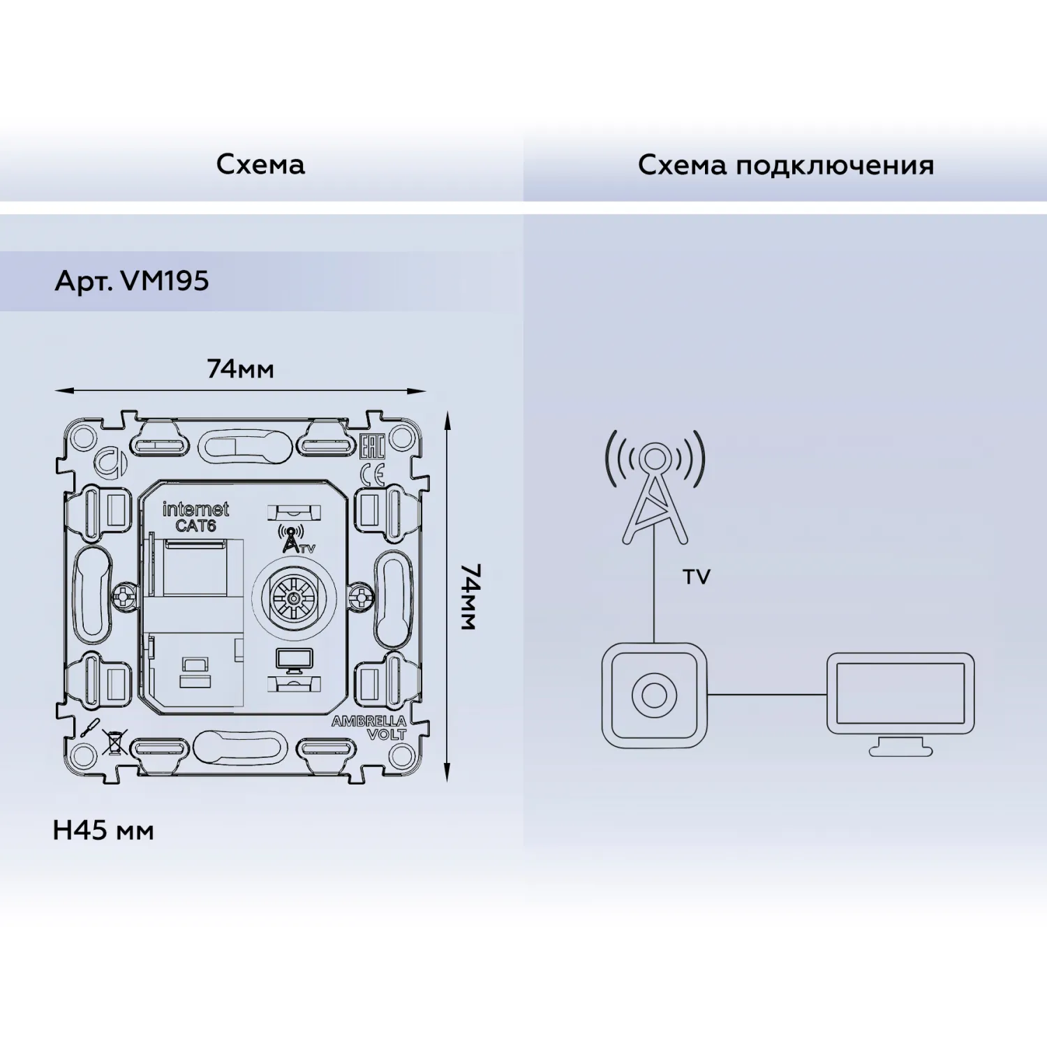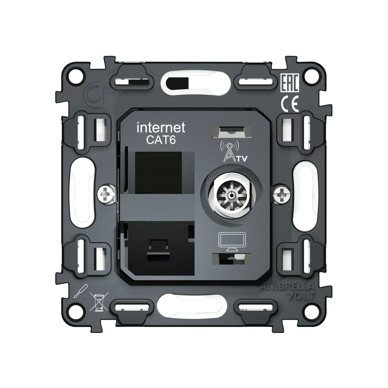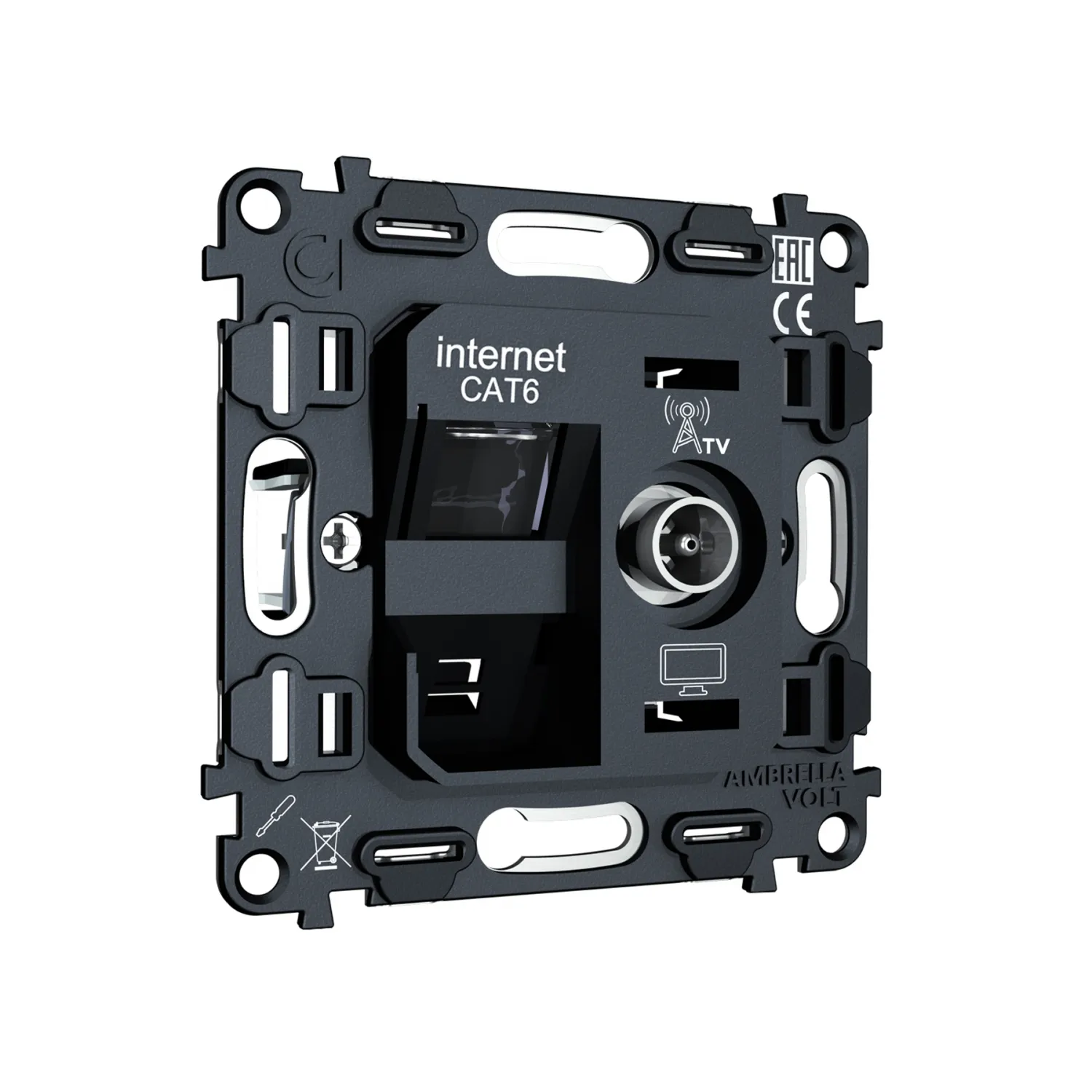 Магазин ImperiumLOFT представляет Вашему вниманию Механизм розетки компьютерной + TV оконечной RJ-45 (8P8C) CAT6/50-870 MHz 1dB с автоматической защитной шторкой Volt QUANT VM195 от производителя - Volt.