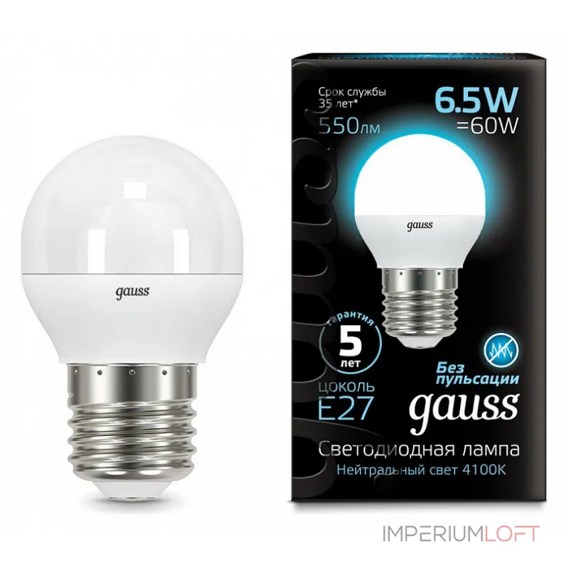 Интернет-магазин ImperiumLOFT доставит Ваш заказ по Москве, Санкт-Петербургу и всей России. Купить представленную модель из раздела «Лампочки и ленты» можно по цене указанной в карточке. Так же наша компания является производителем большинства продукции и может изготовить светильник по Вашему дизайн-проекту, по чертежам за короткий срок. Лампа светодиодная Gauss 1051 E27 6.5Вт 4100K 105102207 - это идеальное решение для тех, кто хочет сэкономить на электроэнергии и получить яркий, комфортный свет. Благодаря светодиодной технологии, эта лампа обеспечивает высокую яркость при минимальном потреблении энергии. С цветовой температурой 4100K, она создает приятное освещение, идеальное для чтения, работы или отдыха. Лампа имеет стандартное цоколь E27, что делает ее совместимой с большинством светильников. Покупая лампу Gauss 1051, вы получаете надежное и эффективное освещение, которое прослужит вам долгие годы.