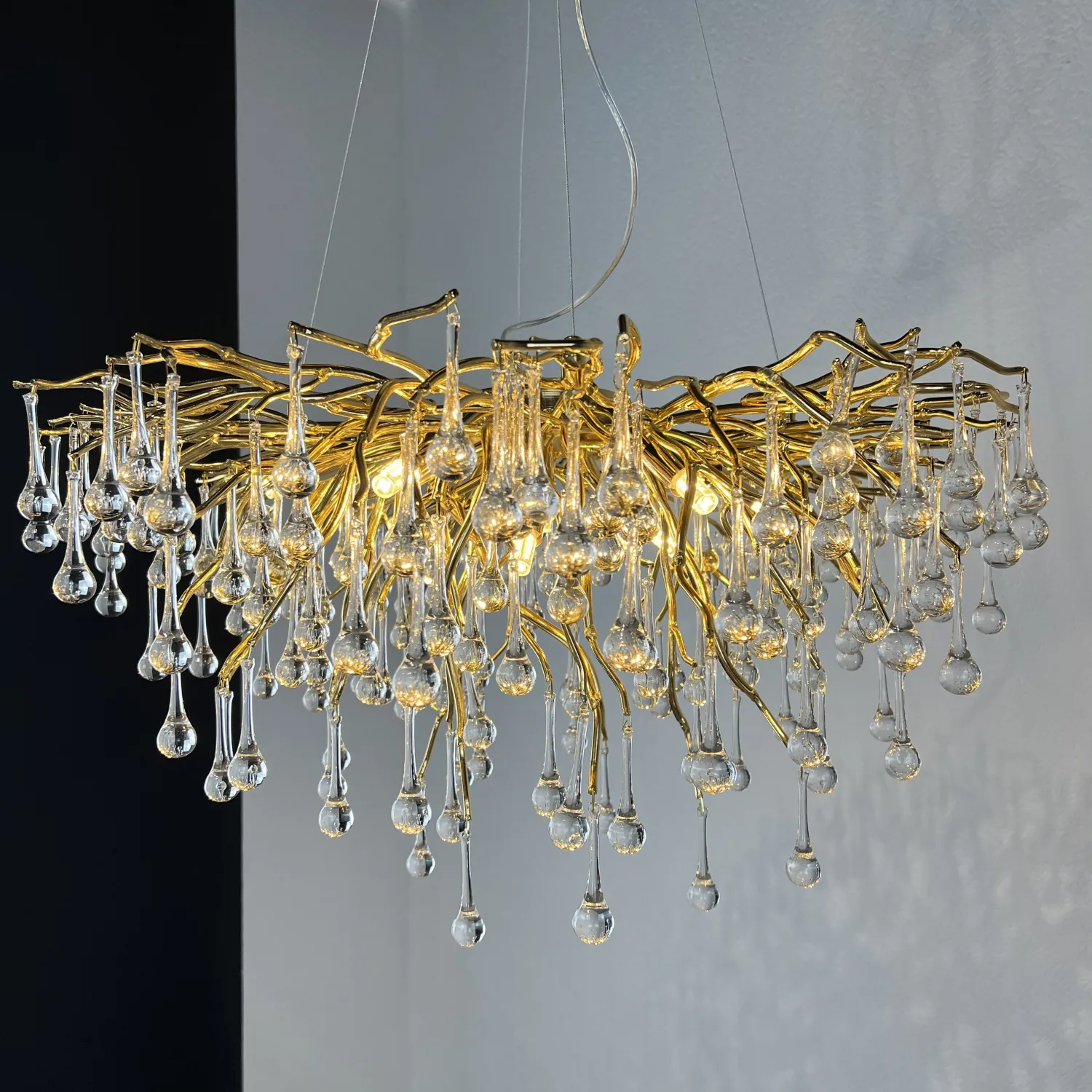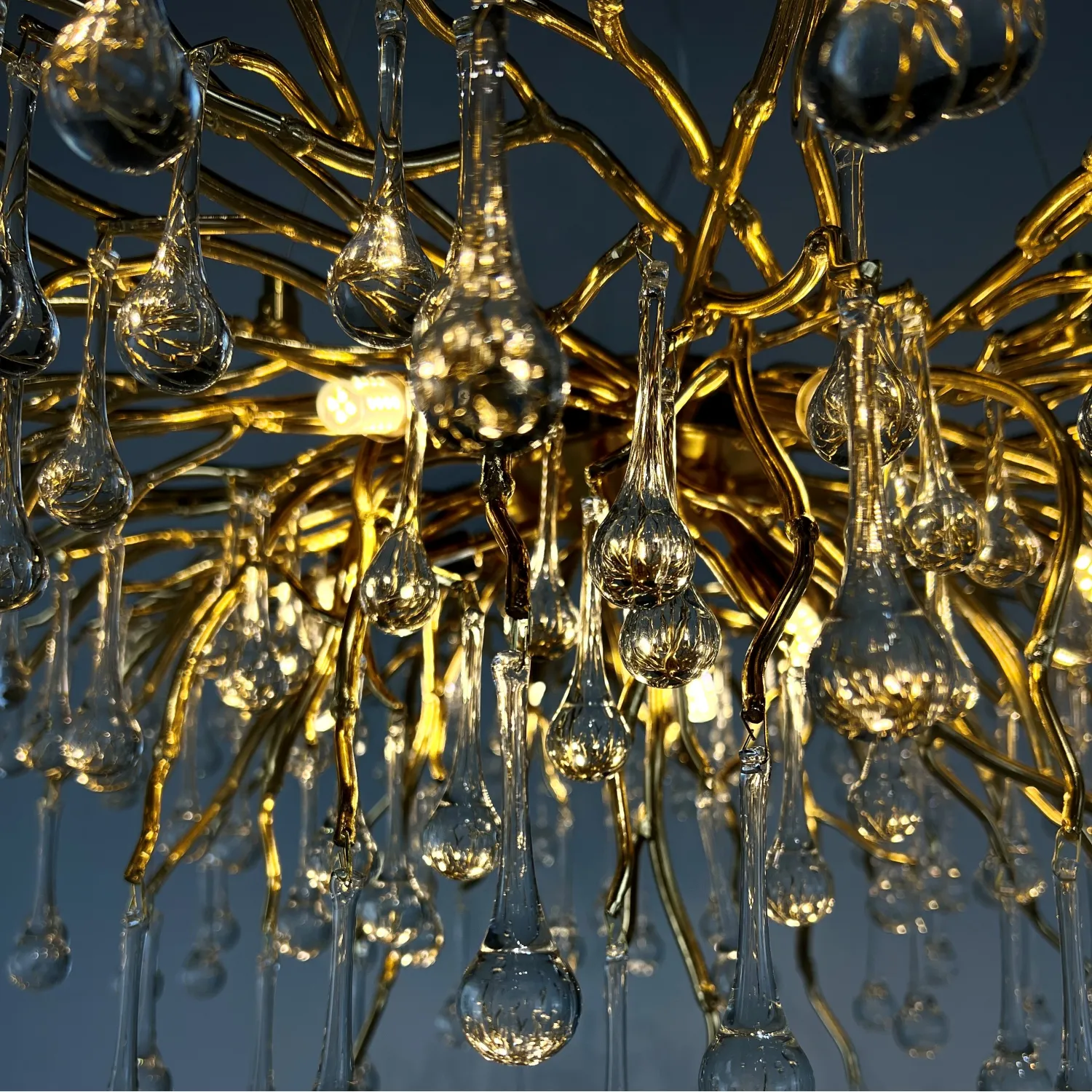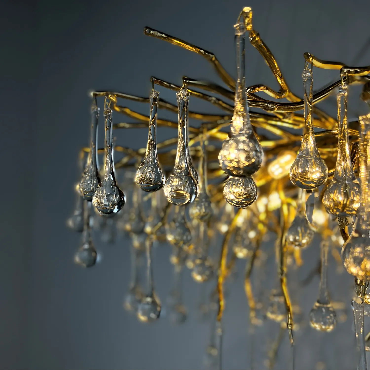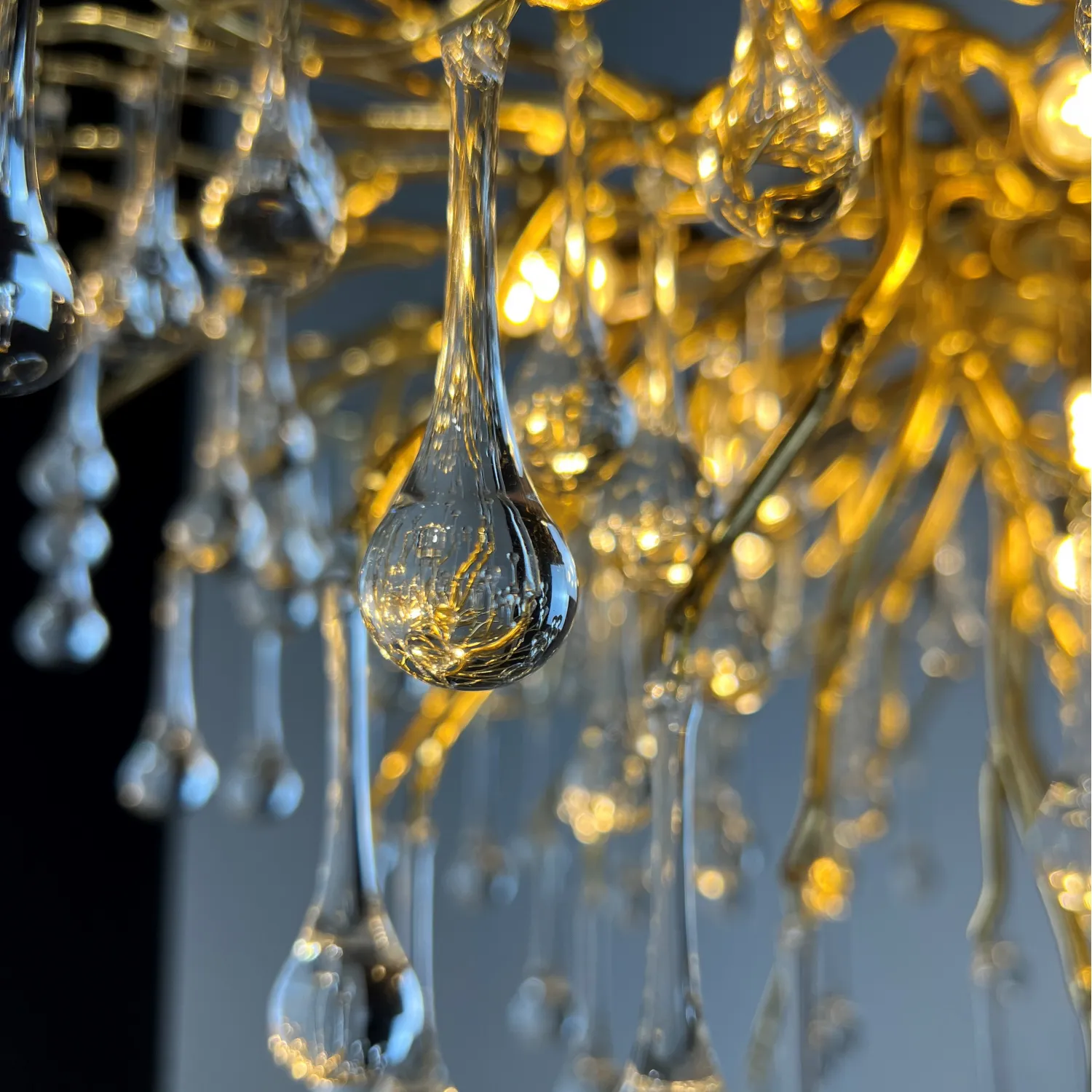 Серия современных люстр на металлическом каркасе с прозрачными подвесками из стекла в виде капель MARIAN