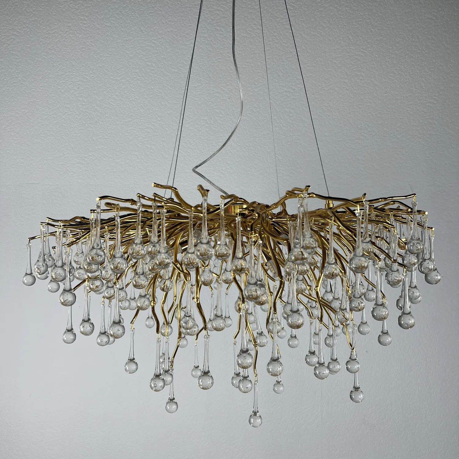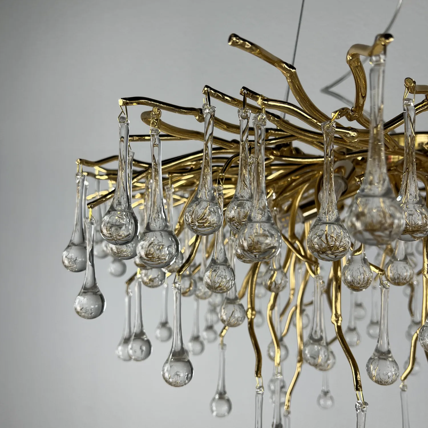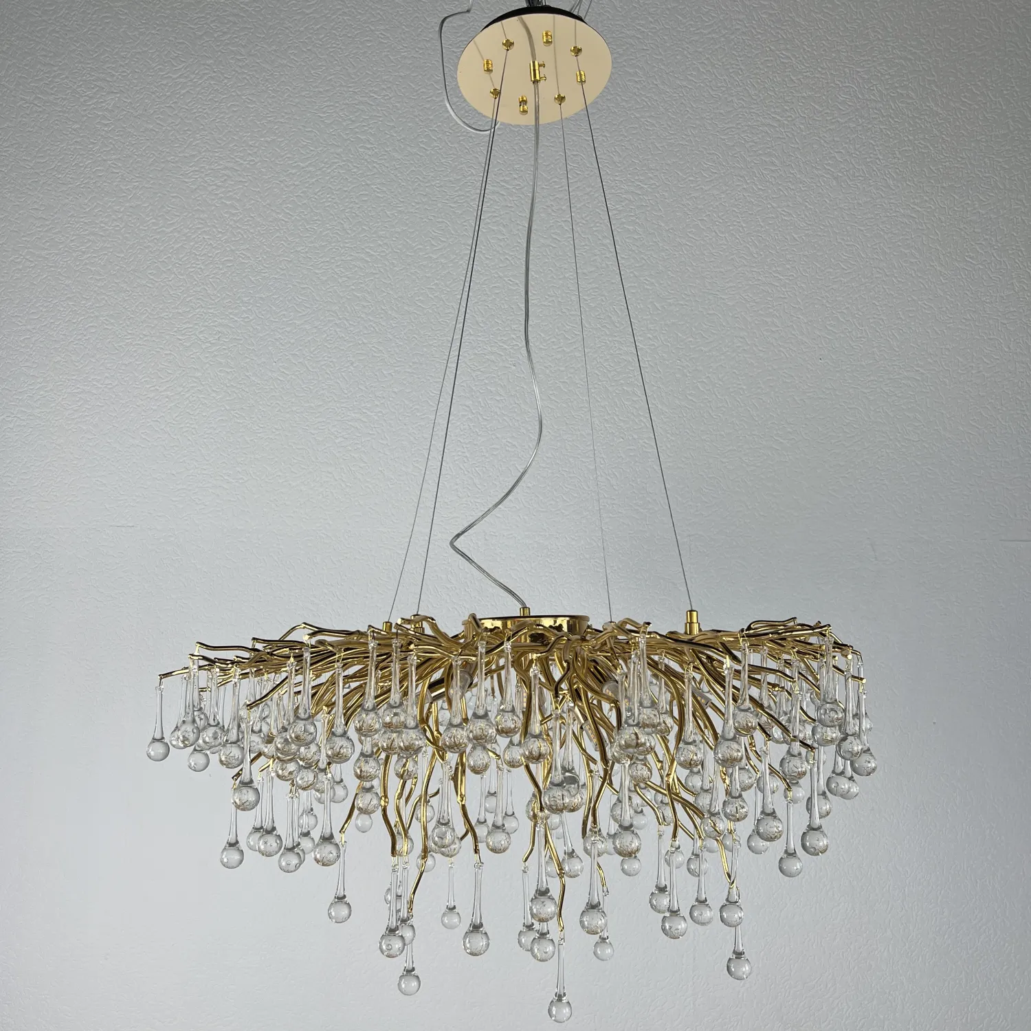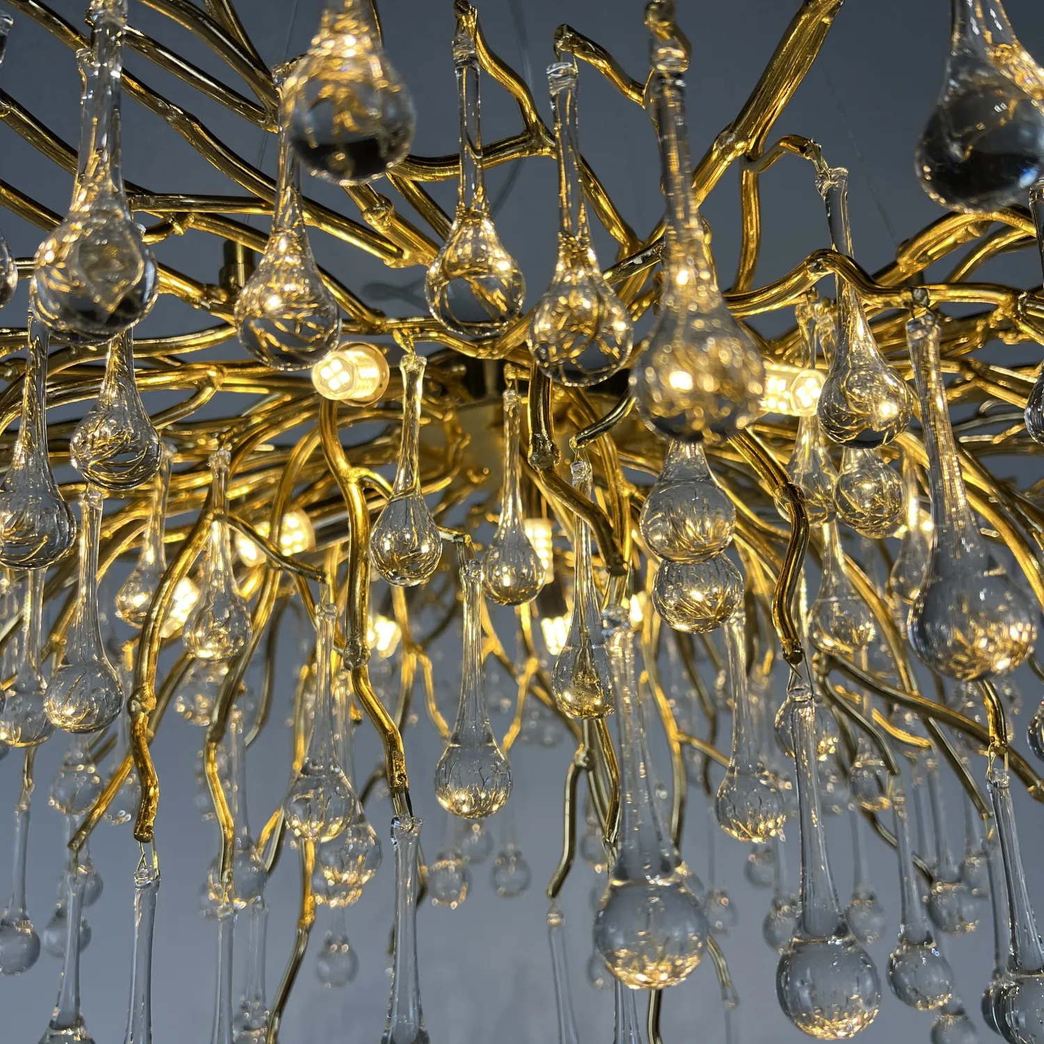 Серия современных люстр на металлическом каркасе с прозрачными подвесками из стекла в виде капель MARIAN