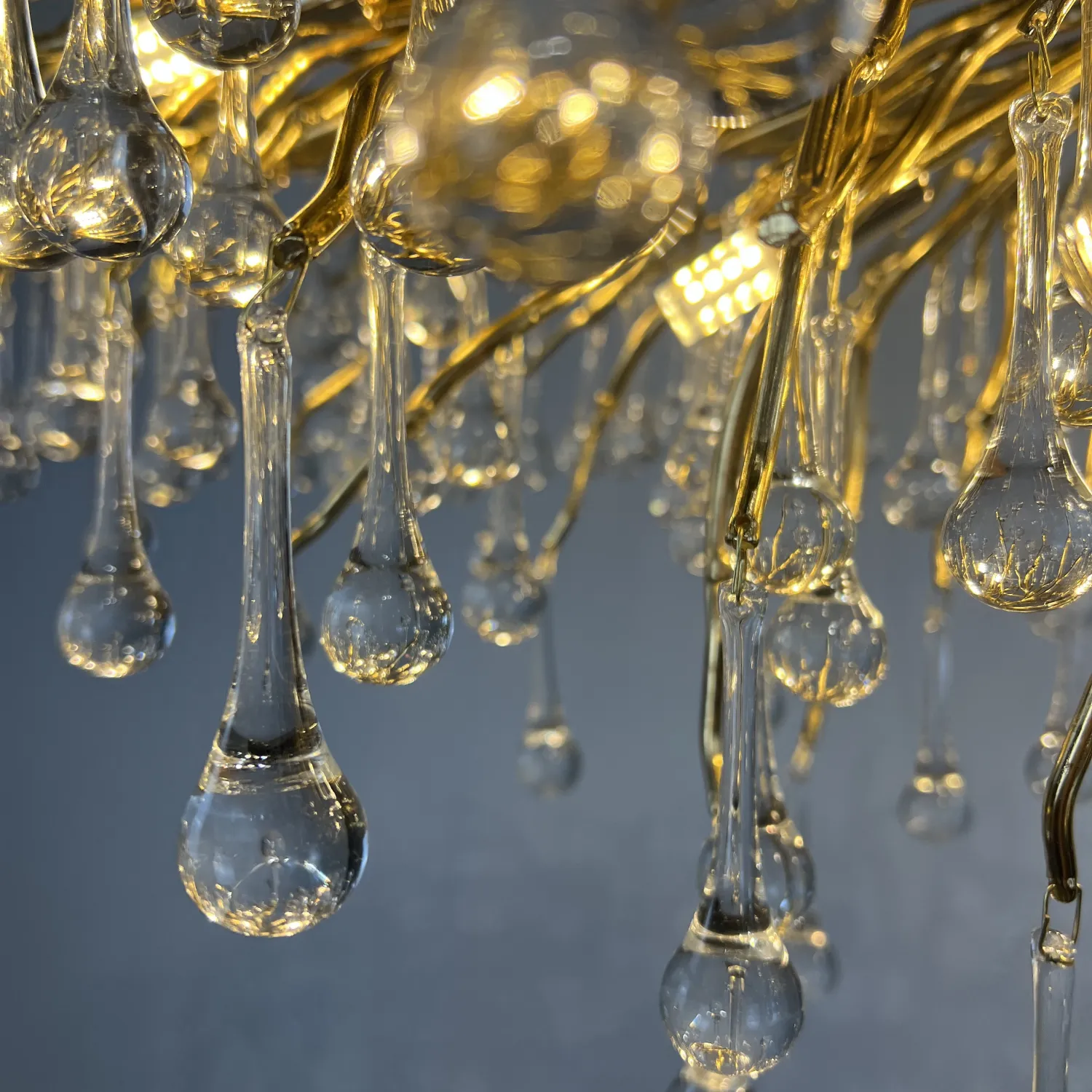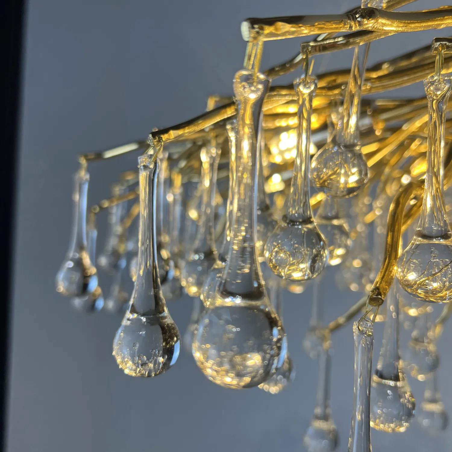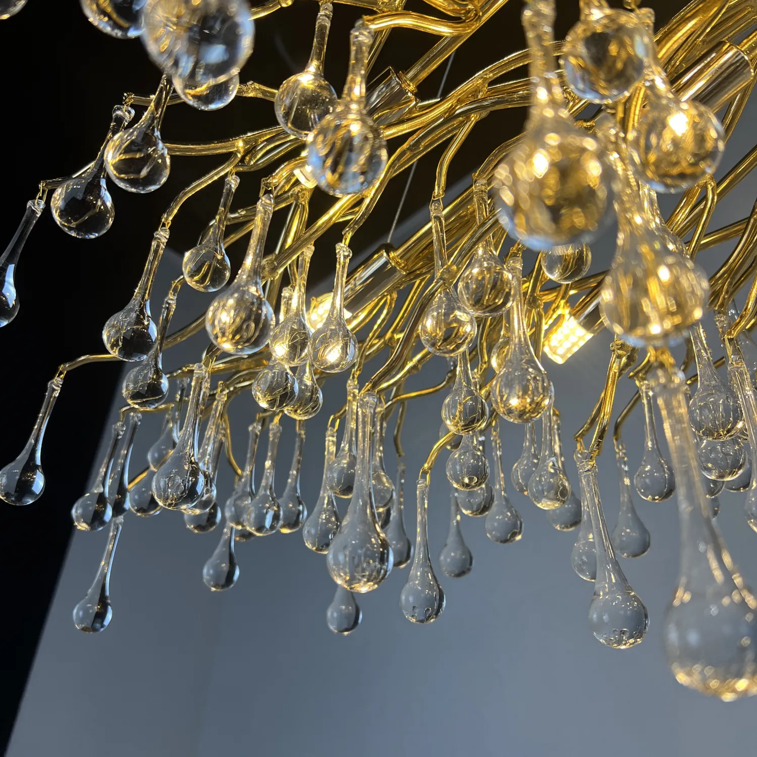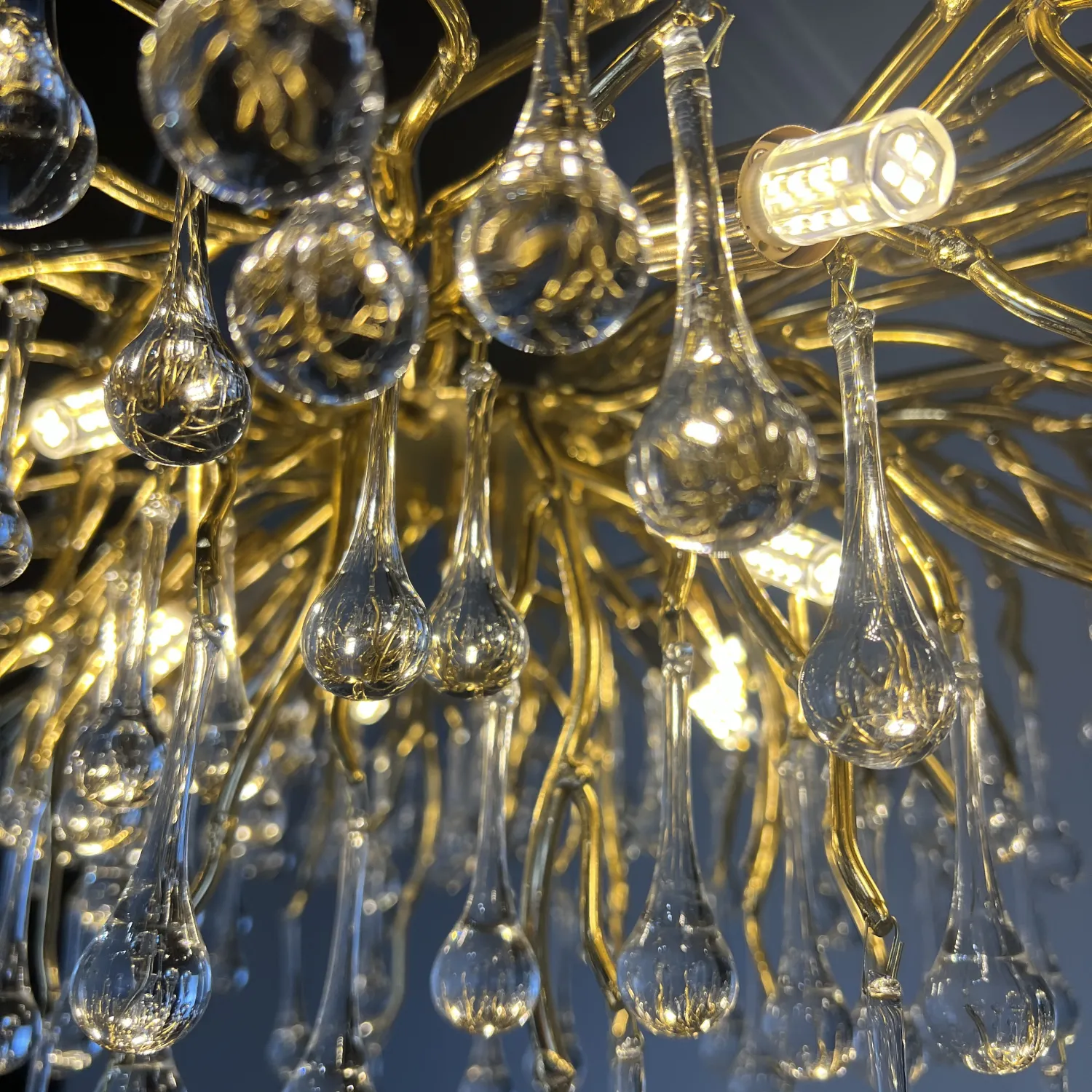 Серия современных люстр на металлическом каркасе с прозрачными подвесками из стекла в виде капель MARIAN