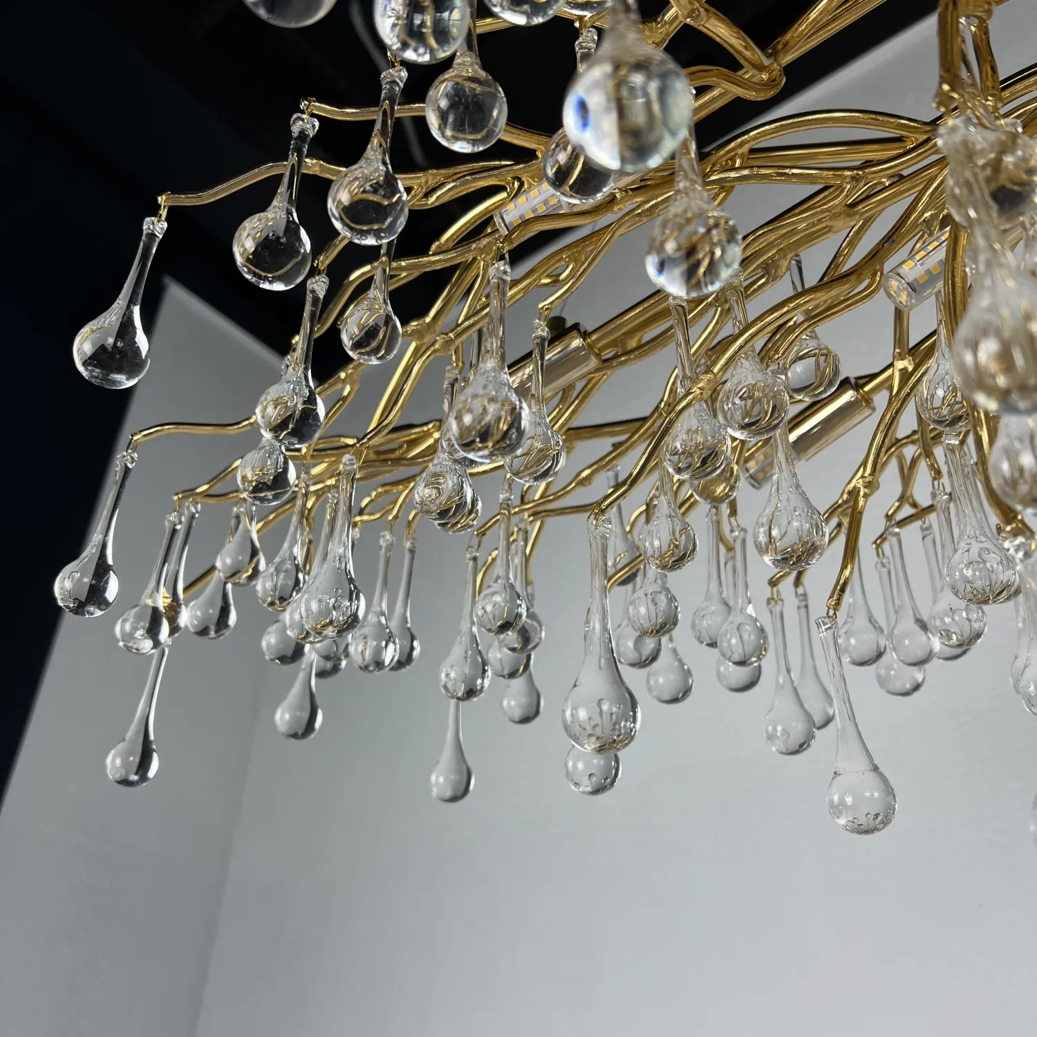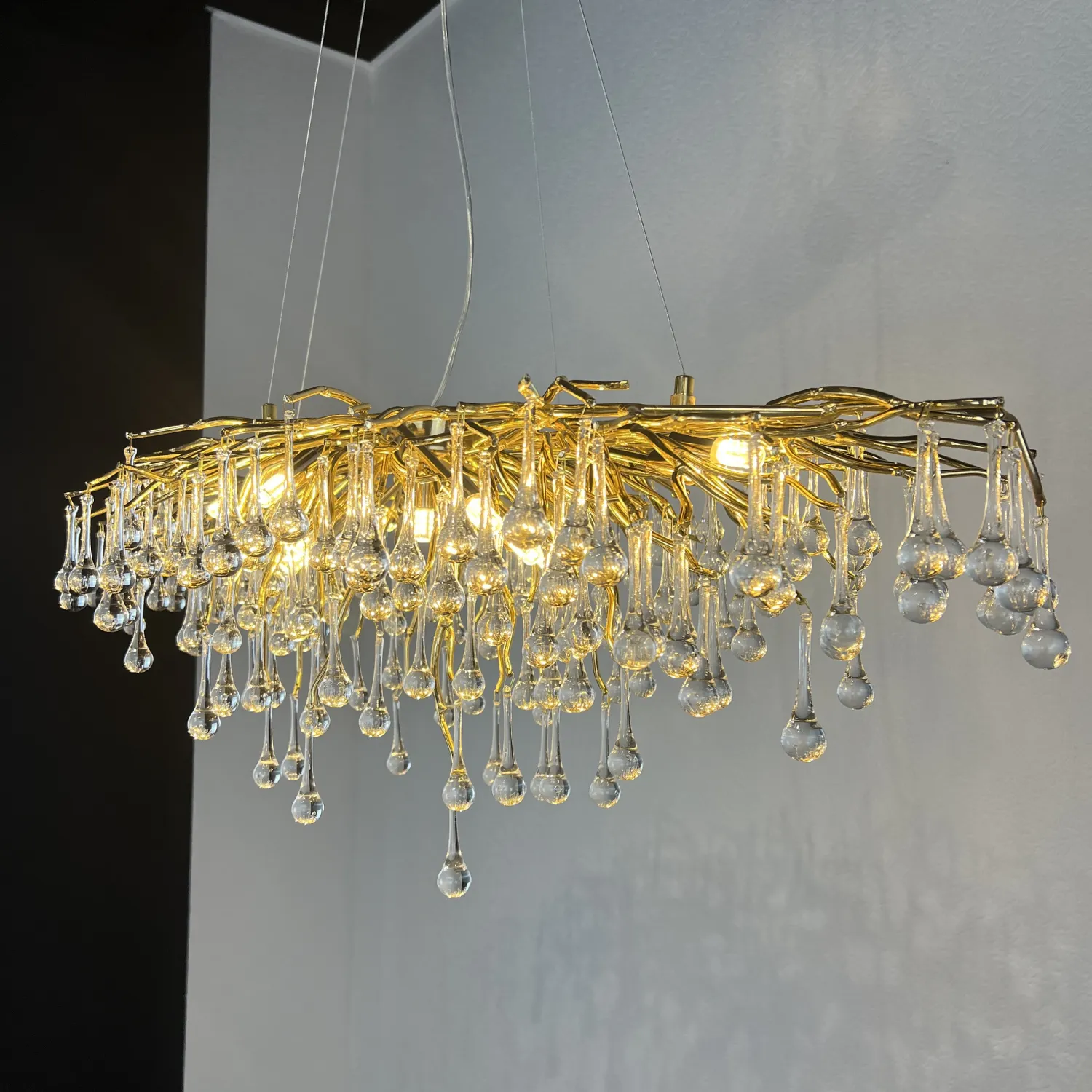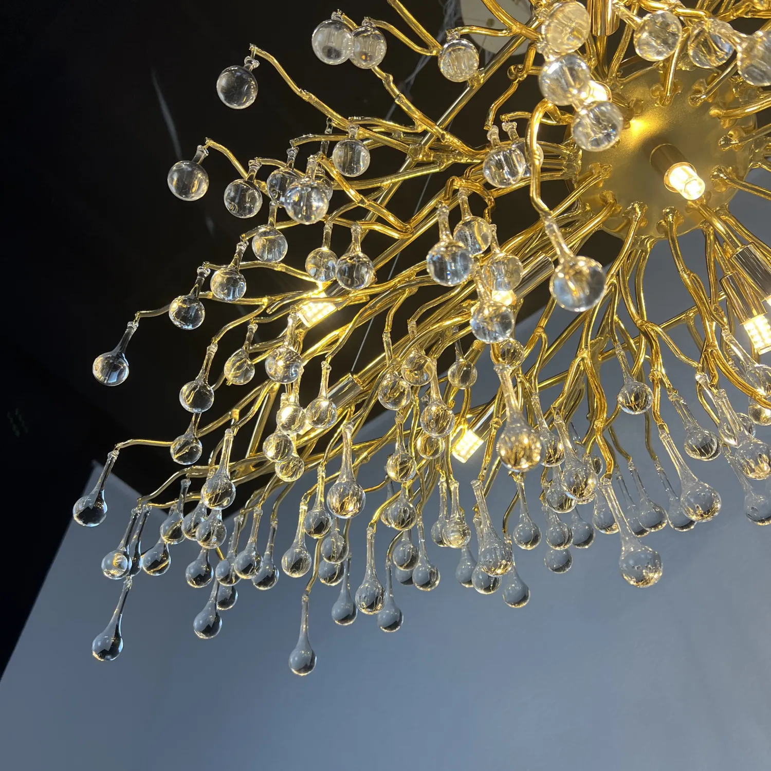 Серия современных люстр на металлическом каркасе с прозрачными подвесками из стекла в виде капель MARIAN