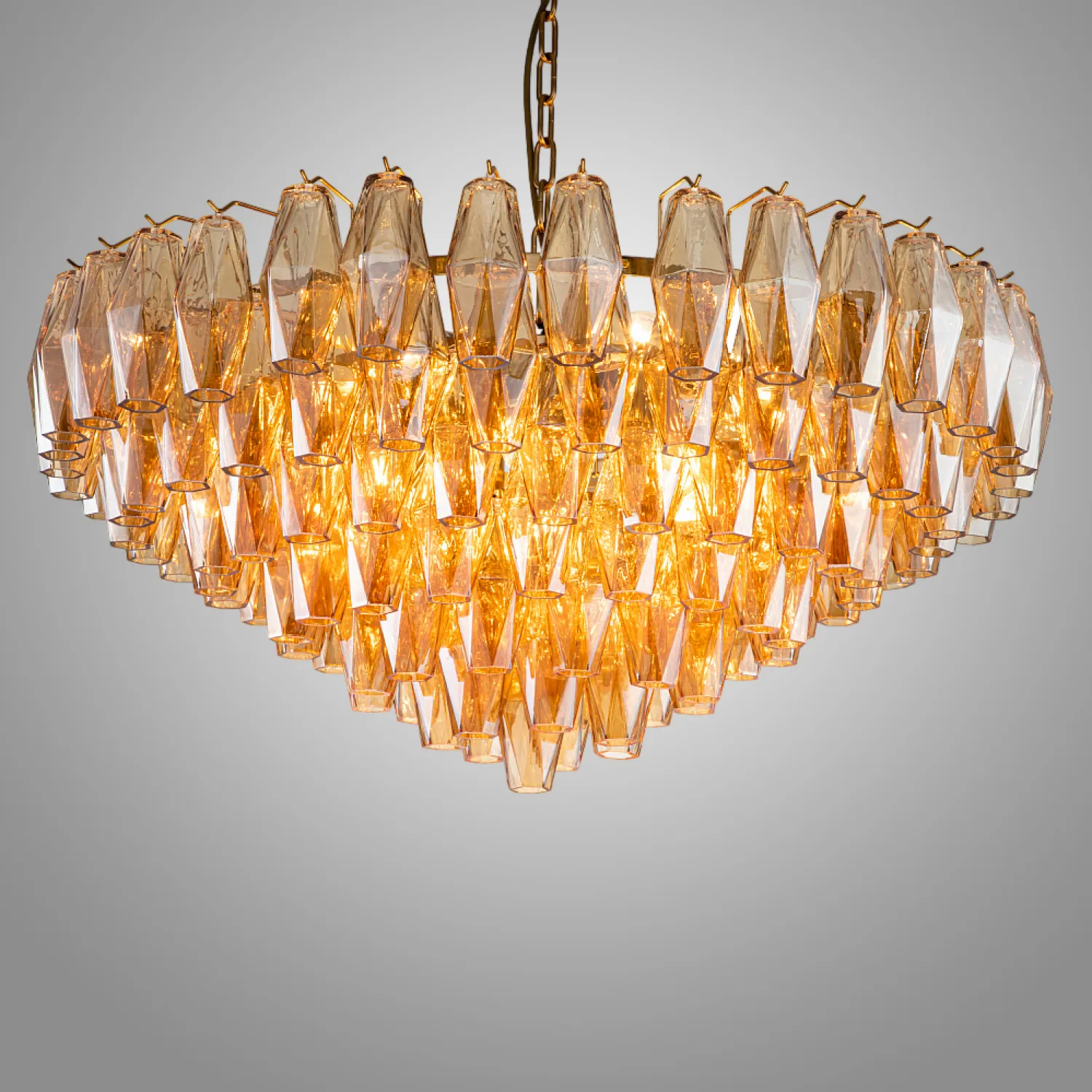 Вереница стеклянных кристаллов amber glass в искусной огранке и металлическое основание в финише brushed brass создают изысканный каскад силуэта люстры Jazz. Словно излучая блеск и шик эпохи «ревущих двадцатых», она станет отражением эстетики роскоши в вашем интерьере.