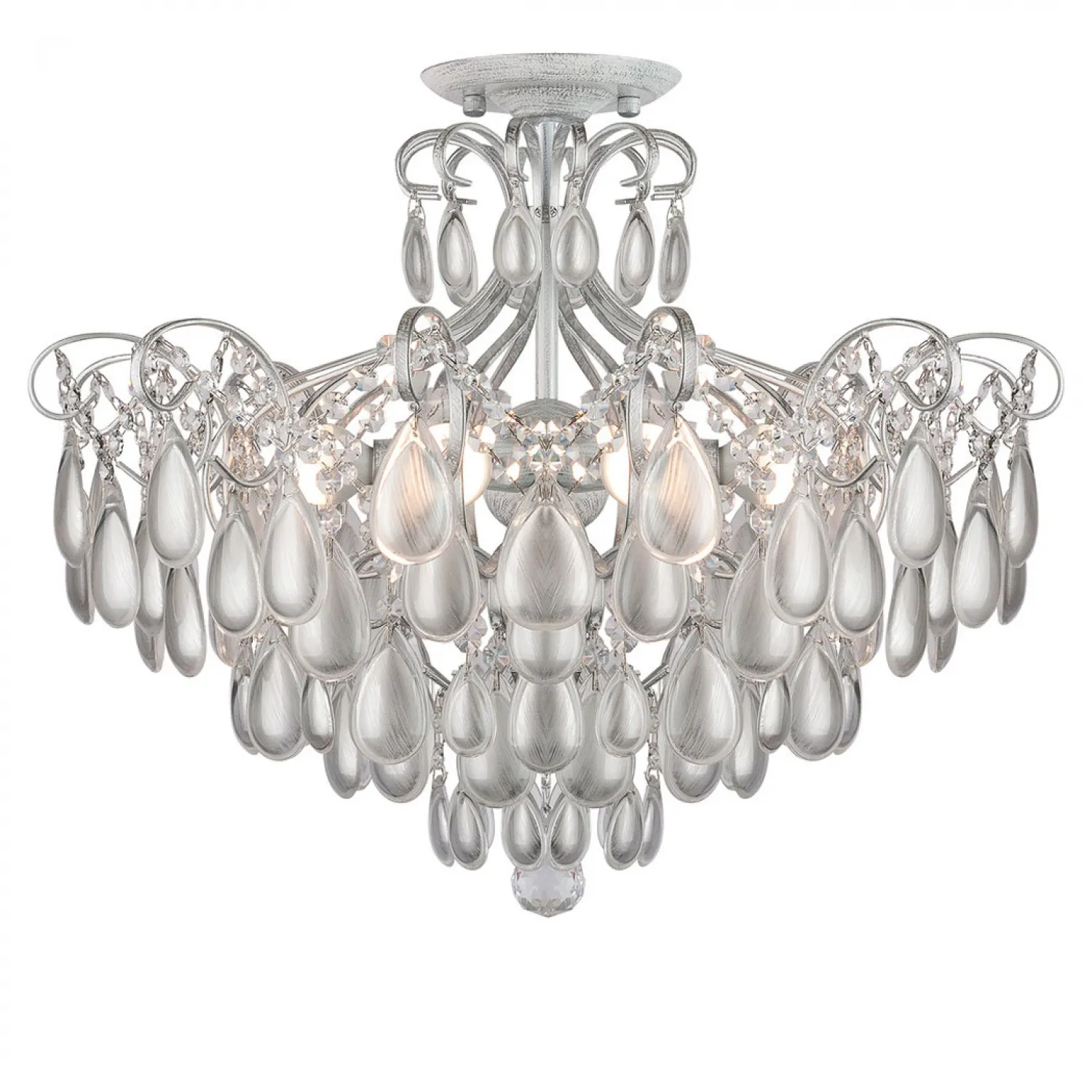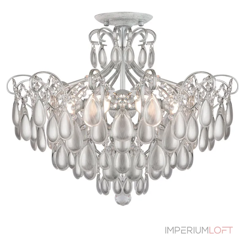 Люстра изготовлена из прочного металла, покрытого серебристым оттенком, который добавит блеск и роскошь в вашу комнату. Четыре плафона из матового стекла равномерно рассеивают свет, создавая приятную и уютную атмосферу.