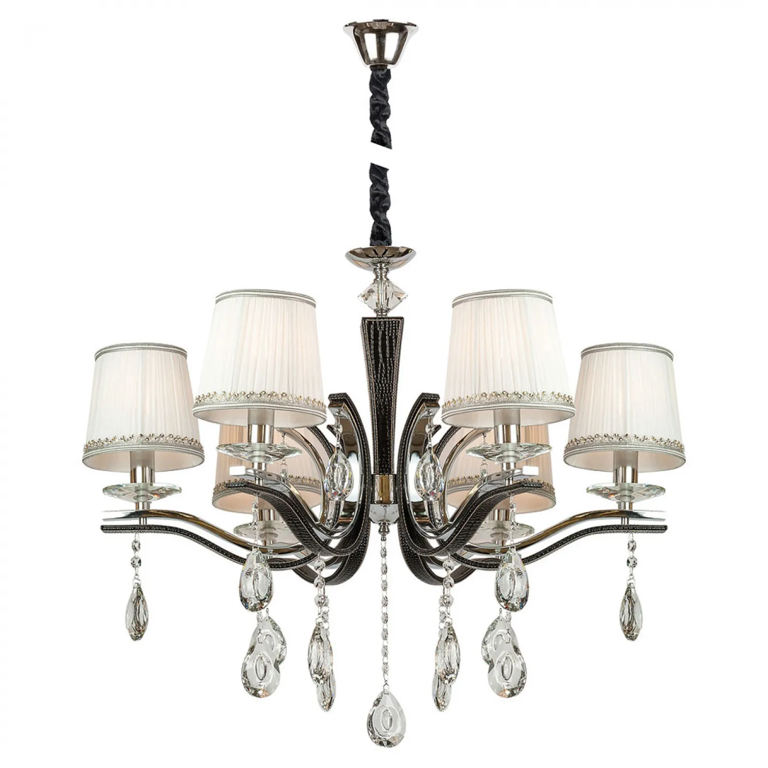 Люстра имеет шесть светильников, которые обеспечат яркое и равномерное освещение в вашем помещении. Они расположены на специальном металлическом каркасе, который придает люстре легкость и изящество. Черный цвет каркаса подчеркивает стиль и современность дизайна, а также позволяет люстре гармонично вписаться в любой интерьер.