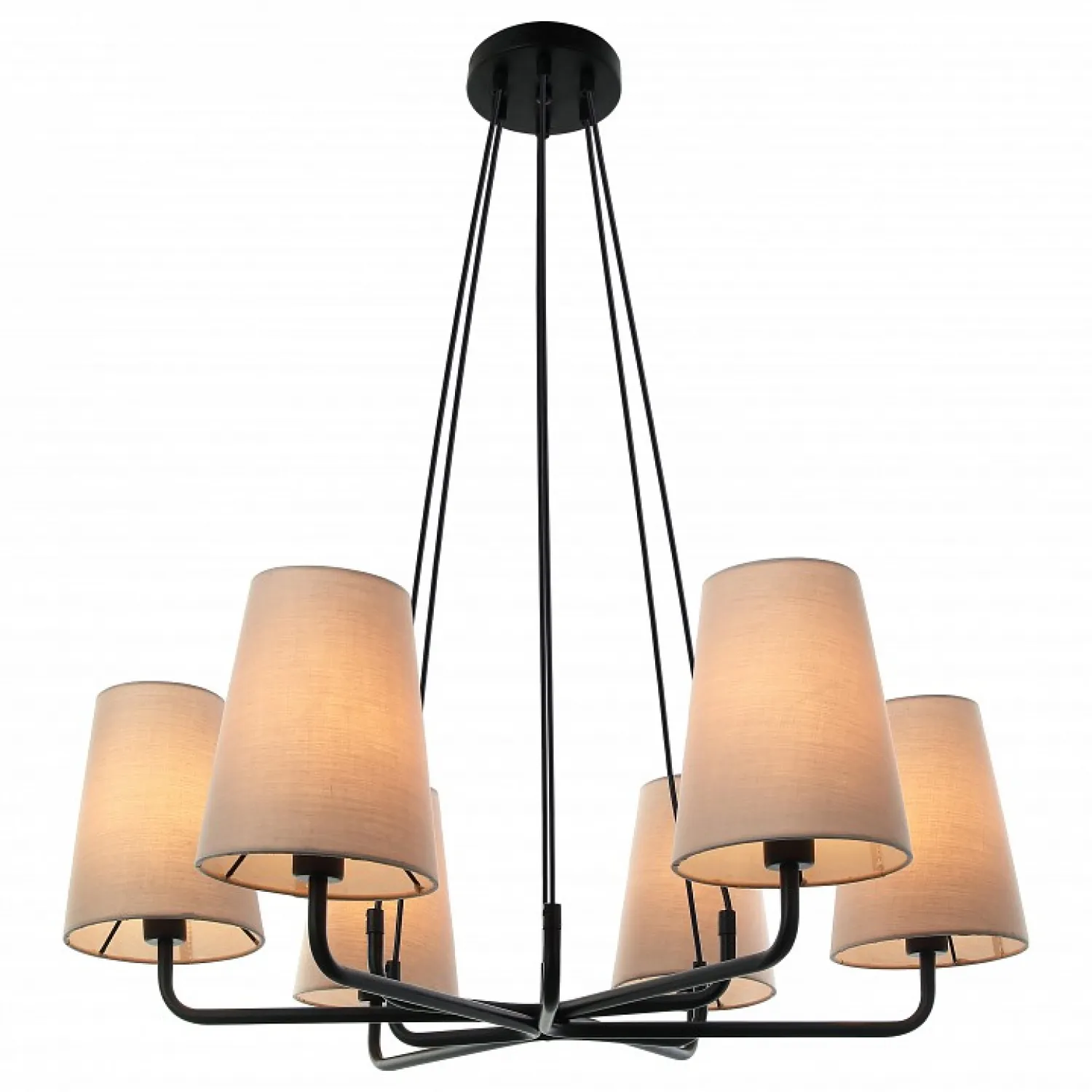 Эта люстра имеет шесть плафонов из матового стекла, которые создают мягкий и приятный свет, наполняющий помещение уютом и теплом. Металлическая арматура выполнена в стильном черном цвете, что придает ей изысканный и современный вид.