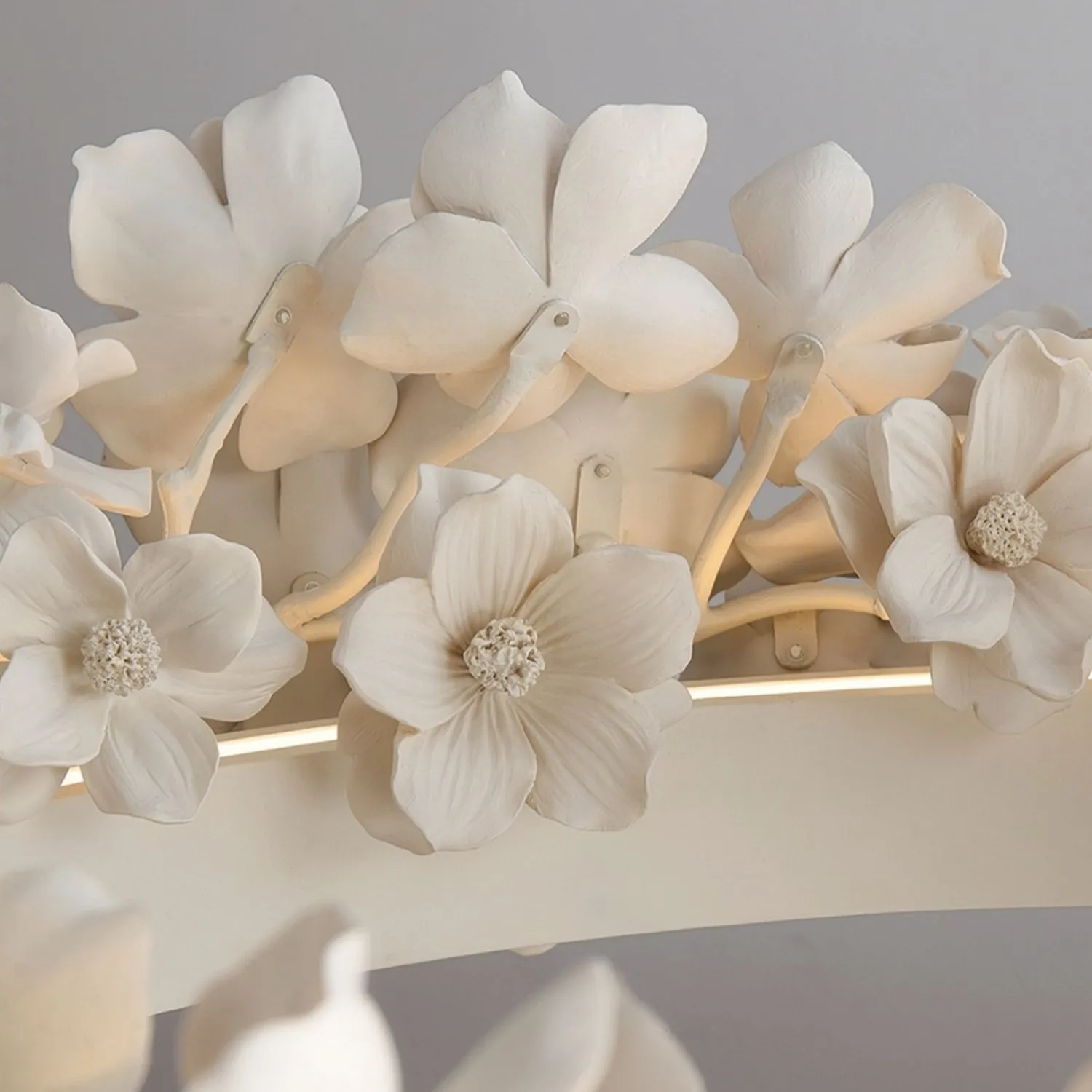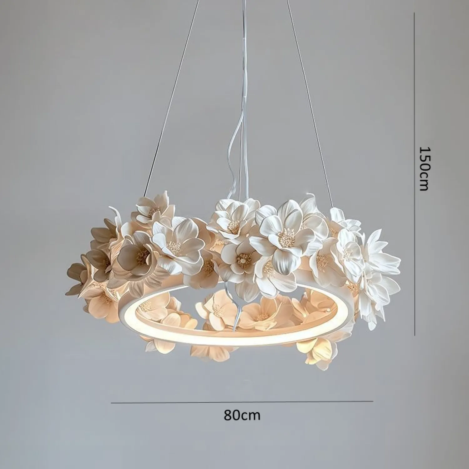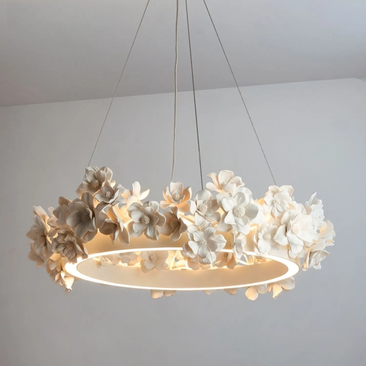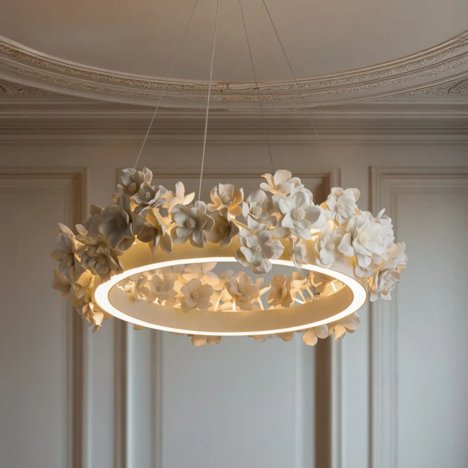 Элегантная подвесная люстра в виде кольца украшена объёмными цветочными элементами в нежных бежево-кремовых оттенках. Дизайн сочетает минимализм и природную эстетику, создавая утончённую атмосферу в интерьере. Мягкий рассеянный свет подчёркивает рельеф лепестков, добавляя уюта и изысканности пространству. Эта люстра станет выразительным акцентом в гостиной, спальне или столовой, гармонично дополняя современный или классический стиль.