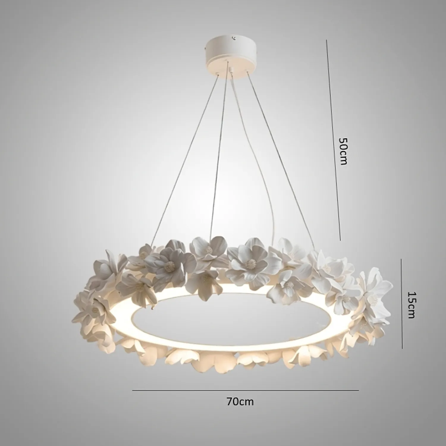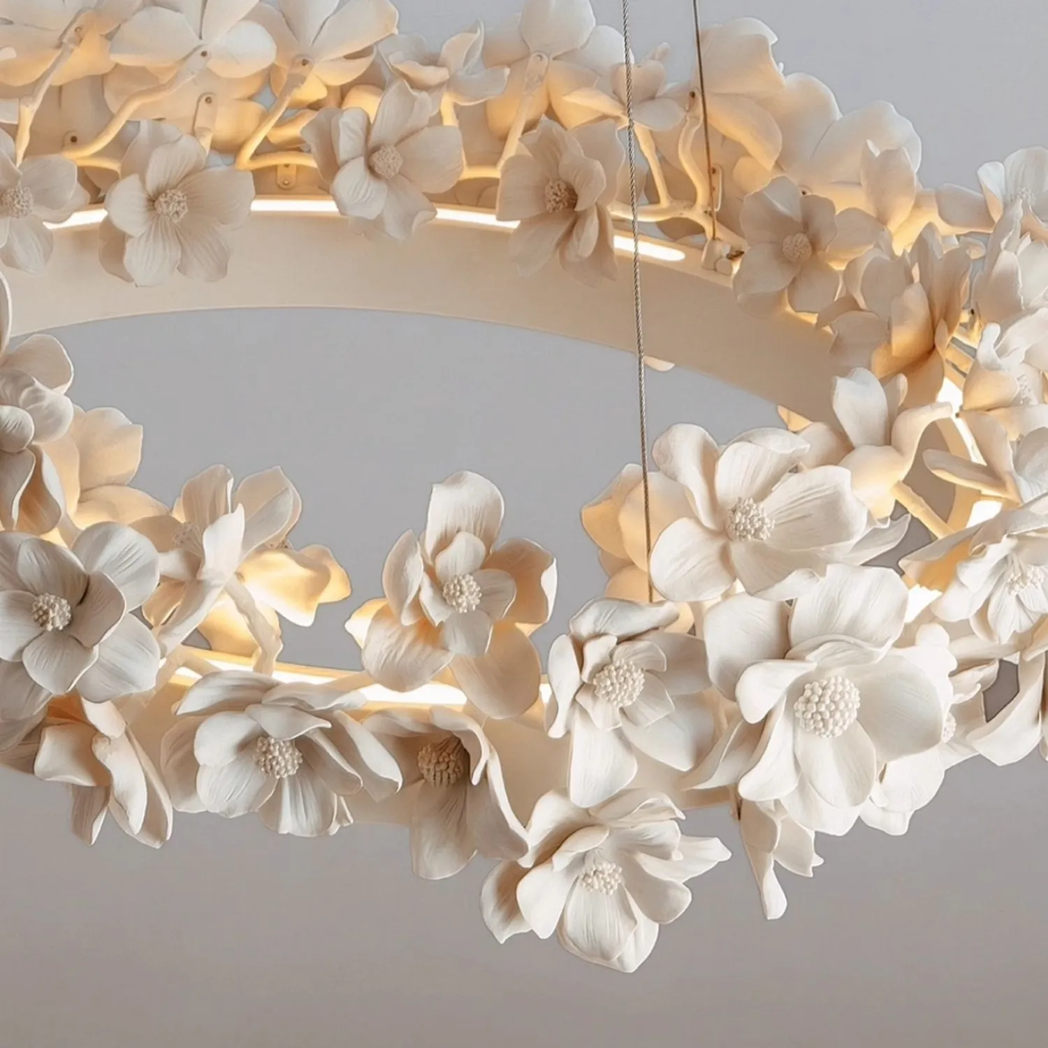 Элегантная подвесная люстра в виде кольца украшена объёмными цветочными элементами в нежных бежево-кремовых оттенках. Дизайн сочетает минимализм и природную эстетику, создавая утончённую атмосферу в интерьере. Мягкий рассеянный свет подчёркивает рельеф лепестков, добавляя уюта и изысканности пространству. Эта люстра станет выразительным акцентом в гостиной, спальне или столовой, гармонично дополняя современный или классический стиль.