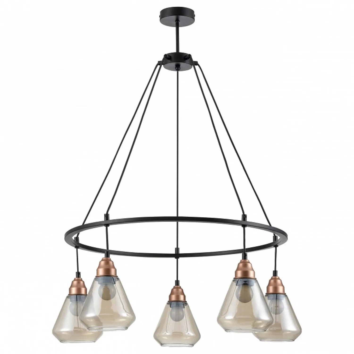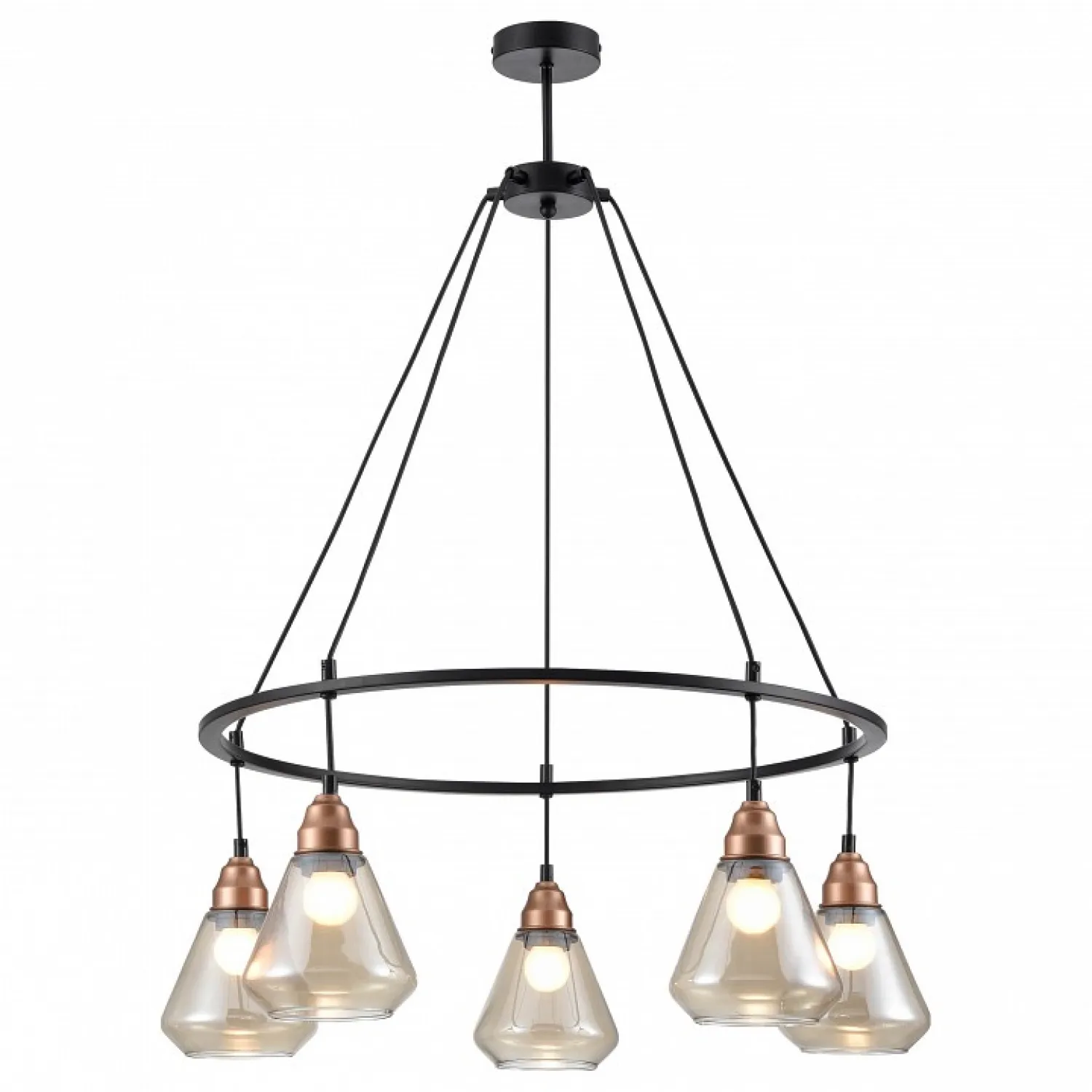 Светильник оснащен пятью плафонами из прозрачного стекла, которые создают прекрасное рассеянное освещение, наполняющее комнату теплым и уютным светом. Благодаря своей регулируемой высоте, вы можете легко настроить люстру под нужные вам потребности и предпочтения.
