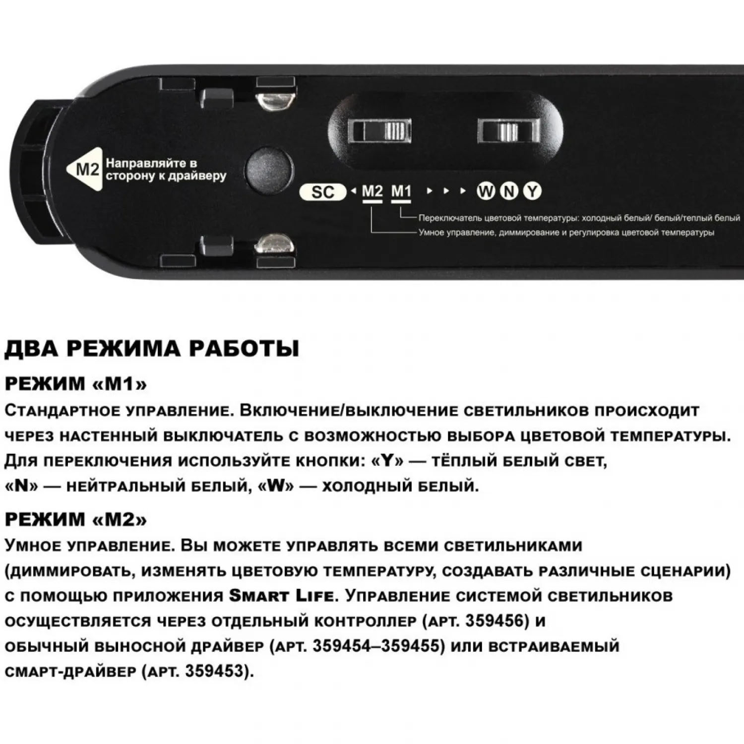 Светодиодные светильники для низковольтного шинопровода поддерживают два режима работы: «M1» и «M2». В режиме «M1» они управляются через настенный выключатель с возможностью выбора цветовой температуры. Для этого используются кнопки: «Y» — тёплый белый свет, «N» — нейтральный белый, «W» — холодный белый. В режиме «M2» доступно умное управление через приложение Smart Life или пульт дистанционного управления. В этом режиме можно диммировать свет, менять цветовую температуру и создавать сценарии освещения. Для работы светильников в этом режиме требуется контроллер (арт. 359456) и драйвер (арт. 359454–359455) либо встроенный смарт-драйвер (арт. 359453). Управление возможно как через пульт, так и через приложение Smart Life. Светильник работает на протоколе TUYA 2,4 ГГц, который не подключается напрямую к домашнему Wi-Fi. Для интеграции светильника в сеть и управления через приложение или голосового ассистента необходим умный шлюз (арт. 359457), который соединяет устройства с вашей Wi-Fi-сетью.