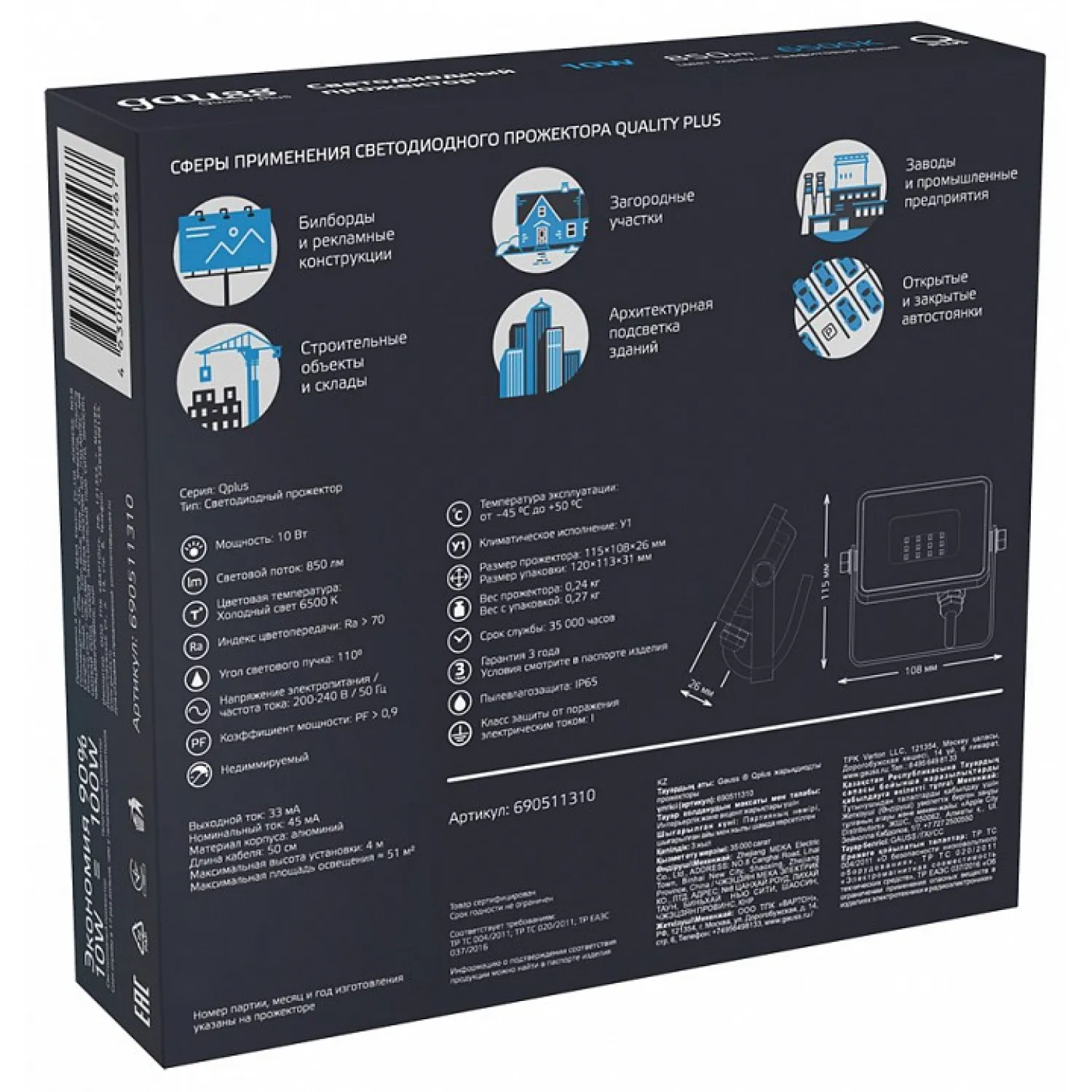 Прожектор Gauss Qplus 690511310 легко монтируется на стену или потолок, что делает его универсальным решением для любого помещения. Вы сможете самостоятельно выбрать наилучшее место для установки и наслаждаться красивым и ярким освещением в любое время.